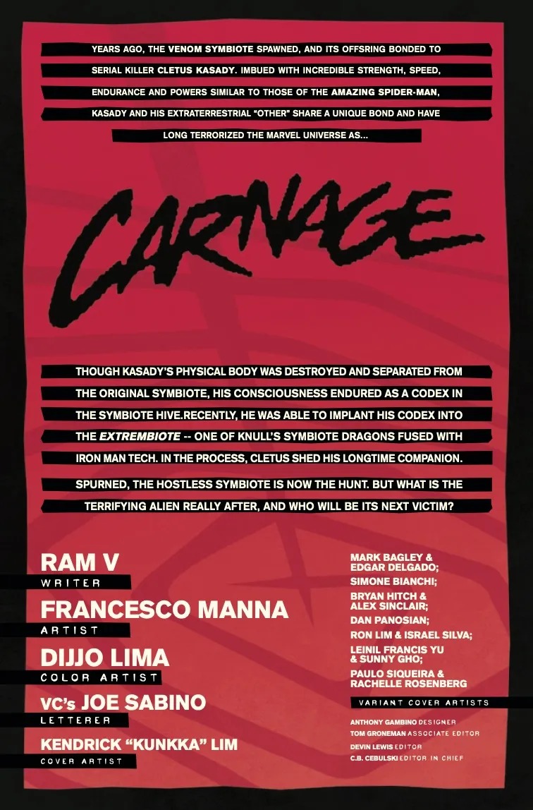 THE BLOODCURDLING CARNAGE SERIES YOU’VE BEEN WAITING FOR! Ram V. has carved a perfect home for himself in the symbiote corner of the Marvel U, and in this all-new ongoing series starring Venom’s most notorious offspring, that corner is about to get a little bit bigger…and bloodier! After the revelations of CARNAGE FOREVER, and in a year that’s set to be a celebration of all things CARNAGE, this is one symbiote story you cannot afford to miss!