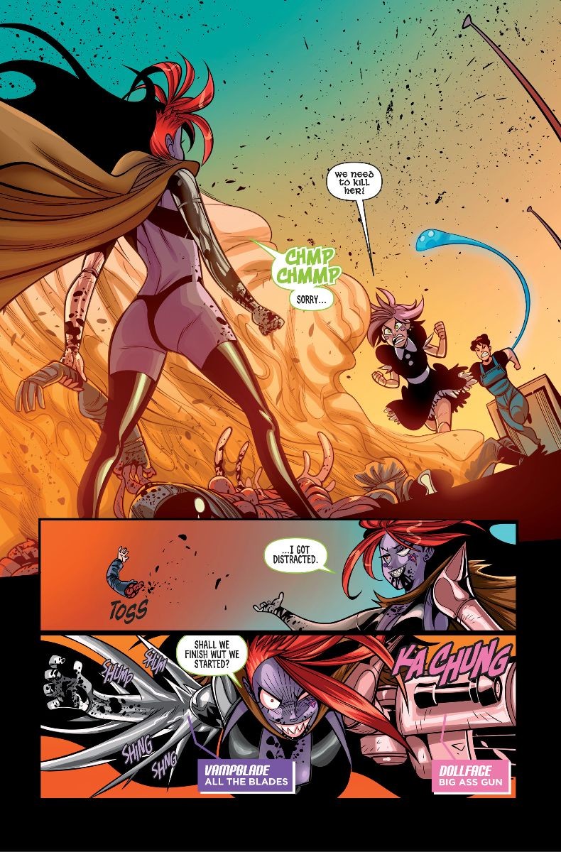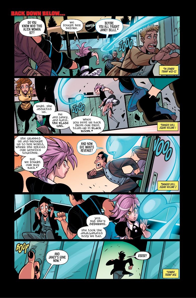 Although Amalgama, the Zombie Tramp/Vampblade/DollFace mash-up character, has reached Earth on her quest to get revenge on the Danger Doll Squad, she’s not able to find two of its founding members. So instead this issue features a face off with an all-new all-different Danger Doll Squad, featuring a couple Danger Doll universe characters fans haven’t seen in a while, including the ball-jointed witch hunter DollFace and the monster hunter for hire Black Betty (plus fan-favorite supporting characters Ivan and Emily).