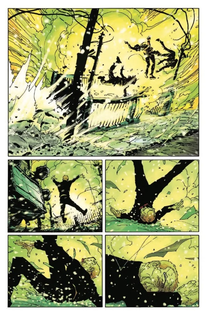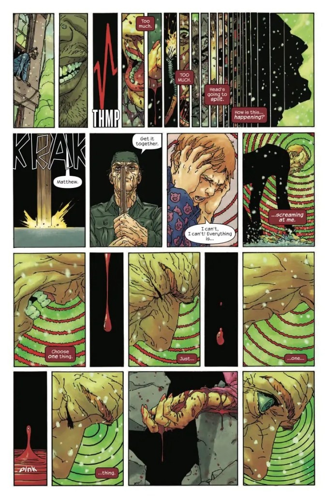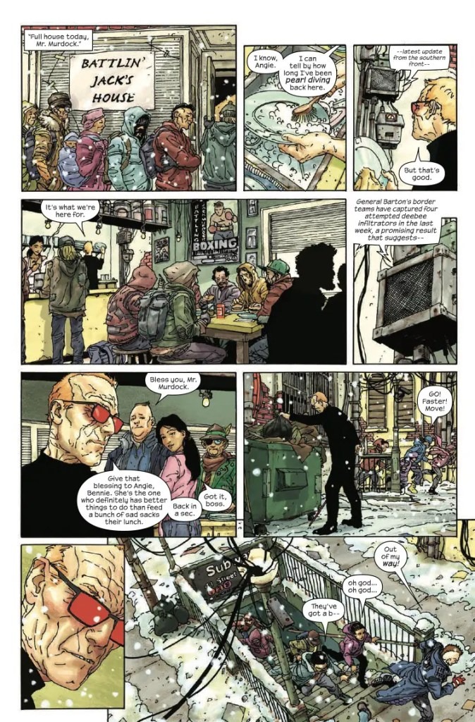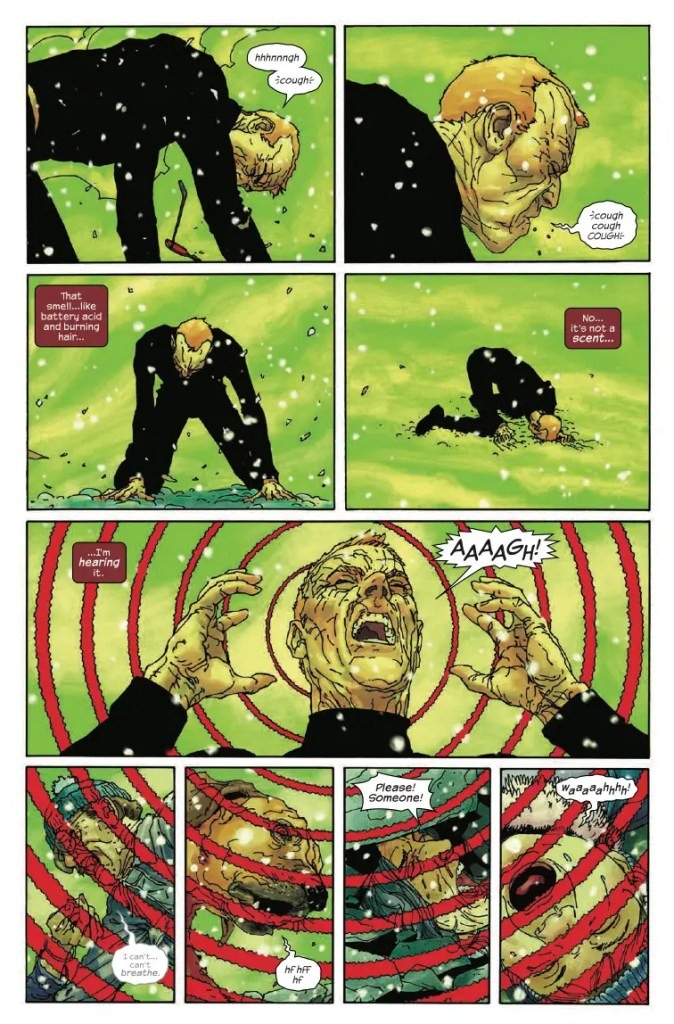 HELL GONE COLD! After a horrific series of events, the world is in shambles. Matt Murdock is old, and his powers have faded to nothing. Matt will not, however, sit by and watch his fellow New Yorkers suffer, so instead of swinging around the city from his billy club line, he slings soup at a food center for the poor. But when a mysterious wrinkly old man interrupts a secret convoy causing an explosion, a deadly gas fills Hell’s Kitchen and this tale takes a turn that will change how you look at the Man Without Fear.