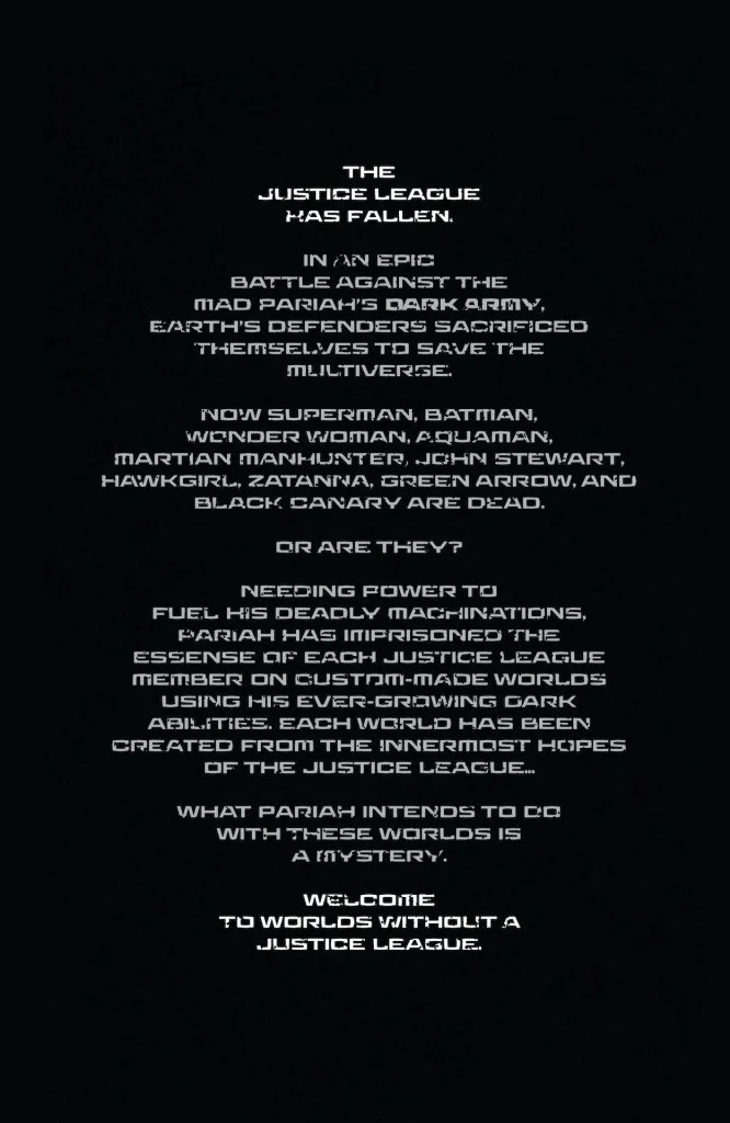 When Pariah and his forces of the Great Darkness laid waste to the most powerful superheroes of all time, all hope was lost…until now. To power his weapons of war, Pariah has captured each member of the Justice League and trapped them on worlds suited to their every dream and desire…while the planets themselves slowly eat away at their respective inhabitants. As Wonder Woman begins a new chapter in her life, Pariah has uprooted her to a reality he controls—how will the Amazon Princess adapt?