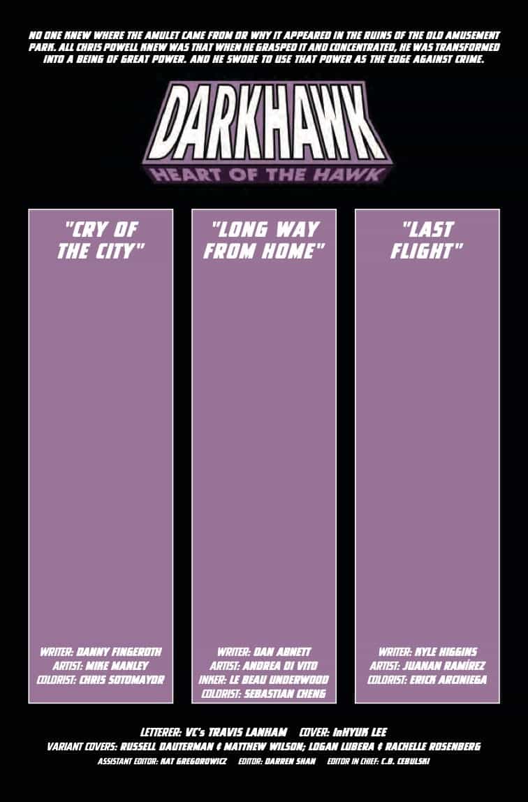 Celebrate the 30th anniversary of the ’90s hottest hero in three spectacular stories! First, an untold story from Darkhawk’s early days by creators Danny Fingeroth and Mike Manley! Then explore the winged hero’s cosmic years by Dan Abnett and Andrea Di Vito. Finally, find out what the future holds for Darkhawk by Kyle Higgins and more!
