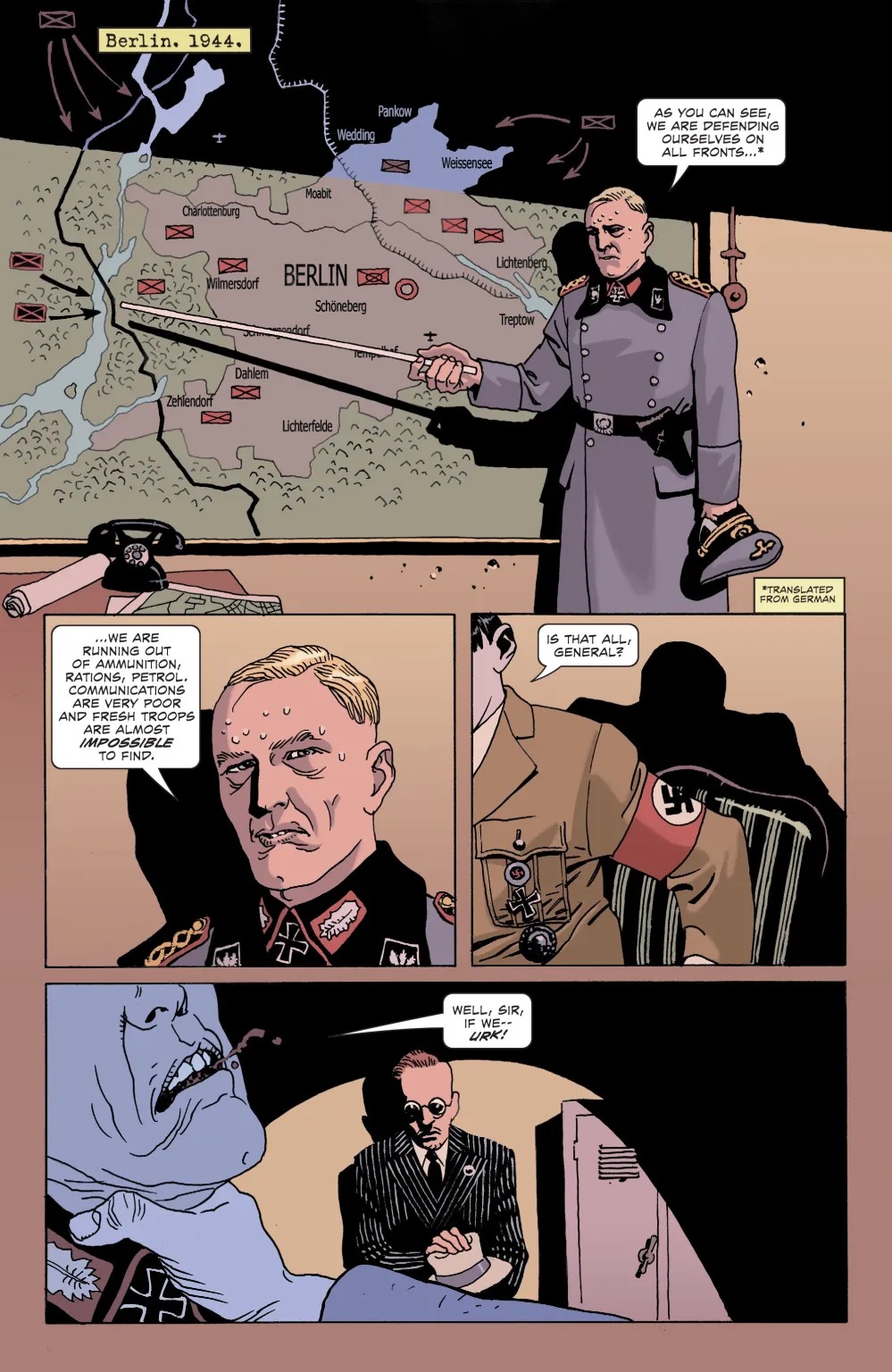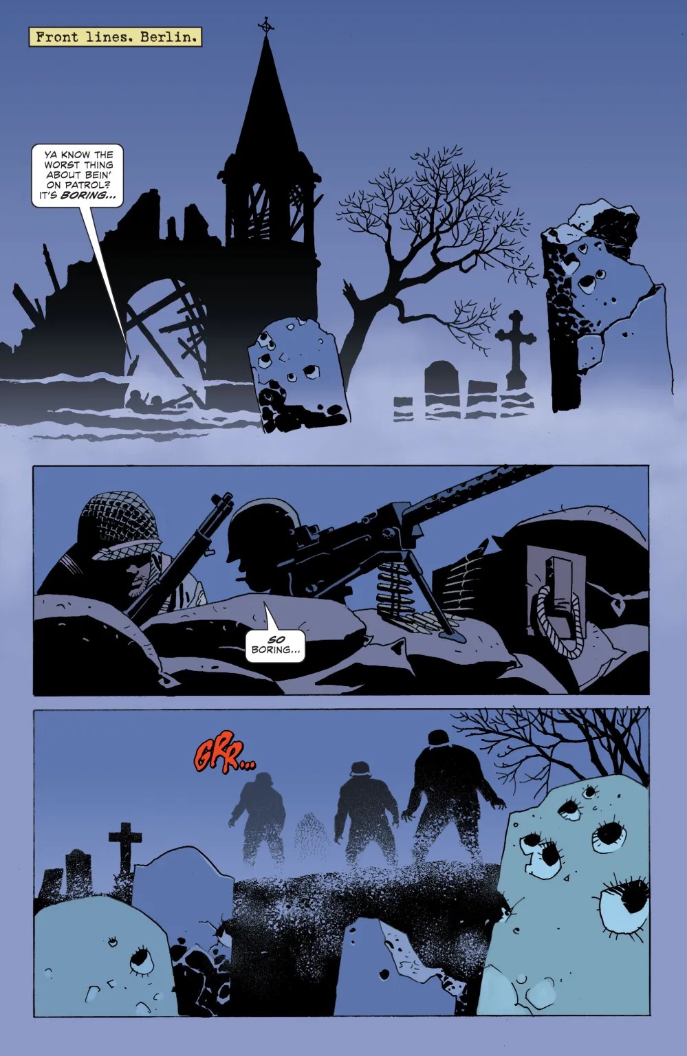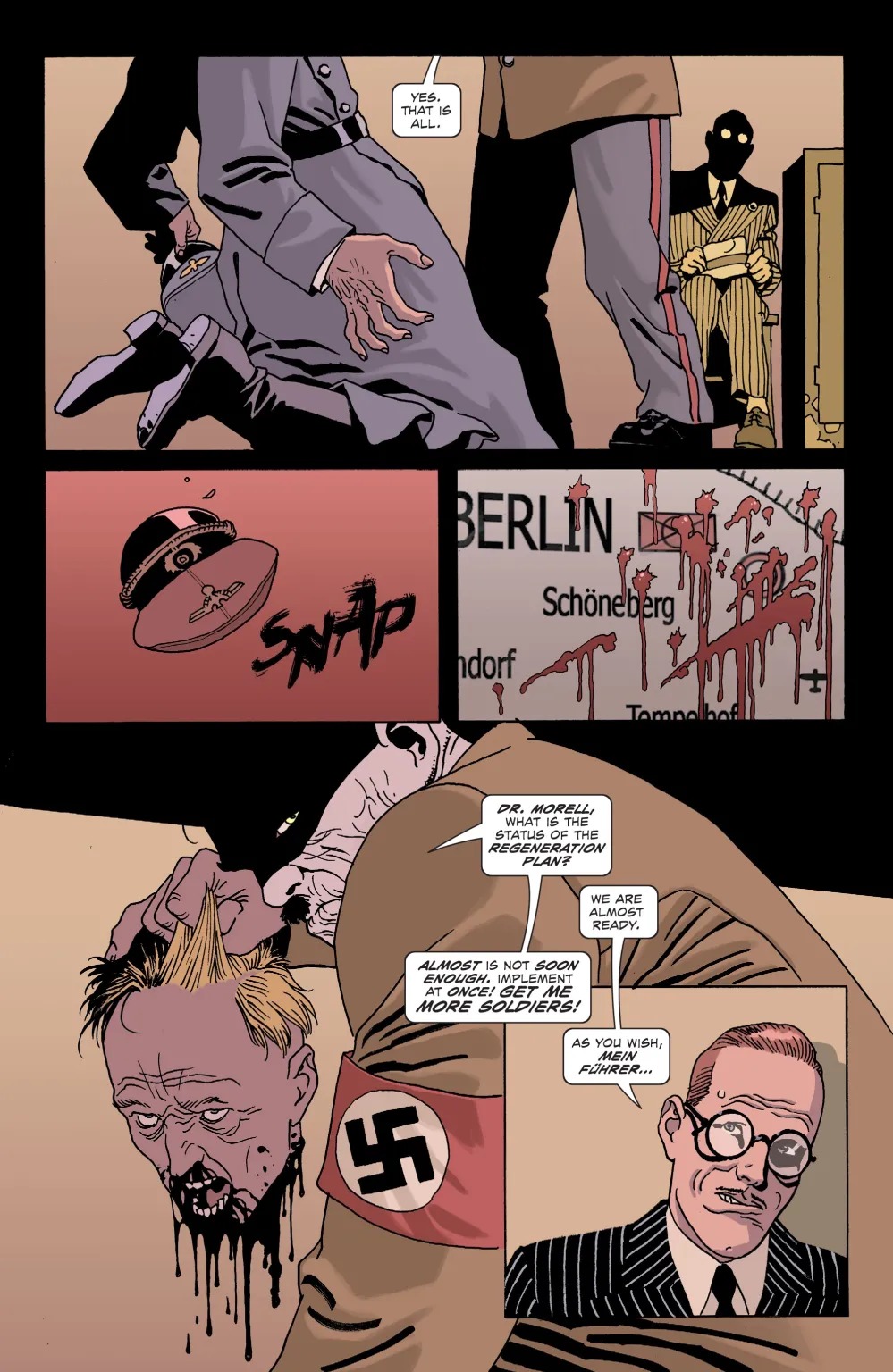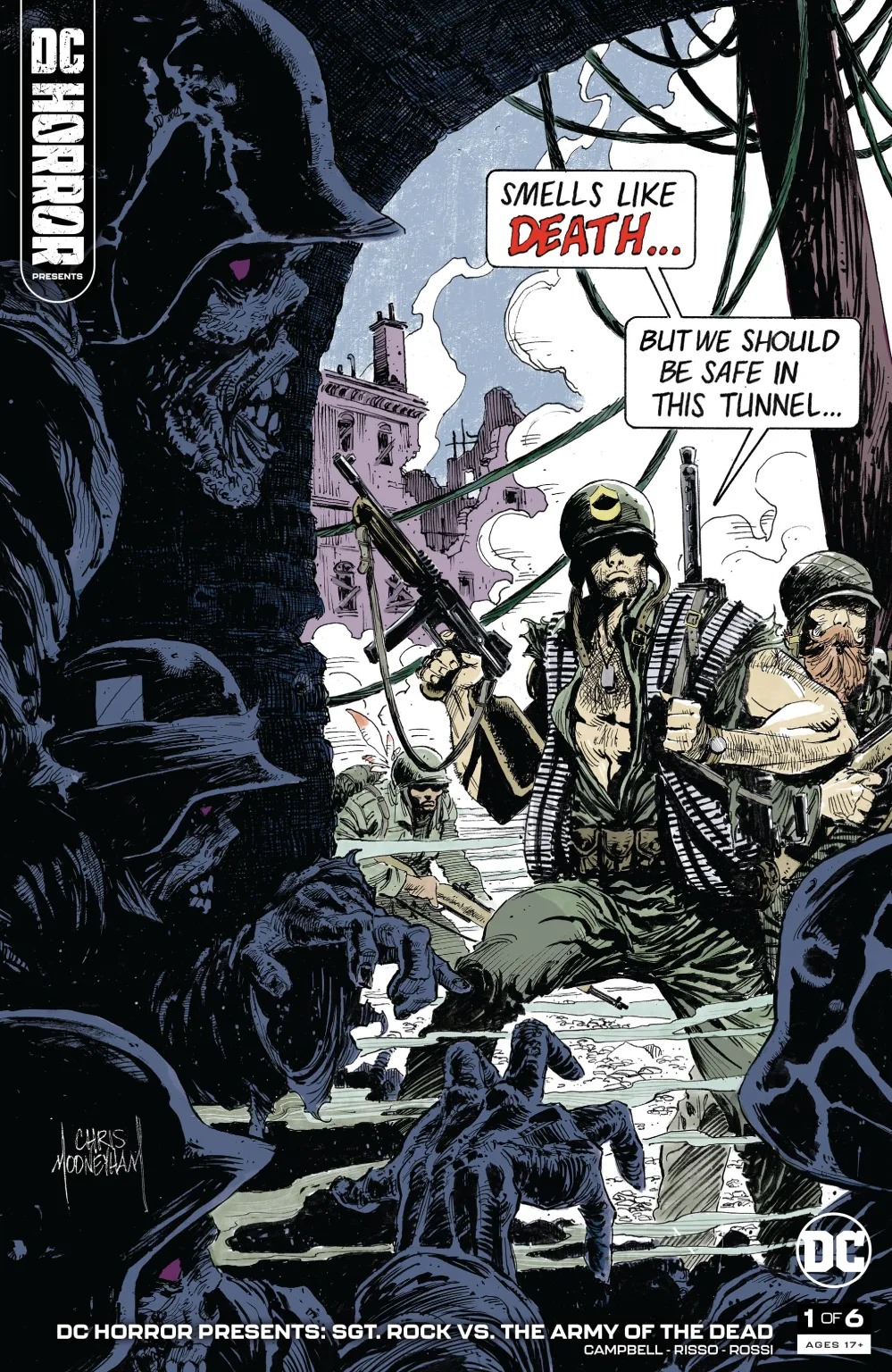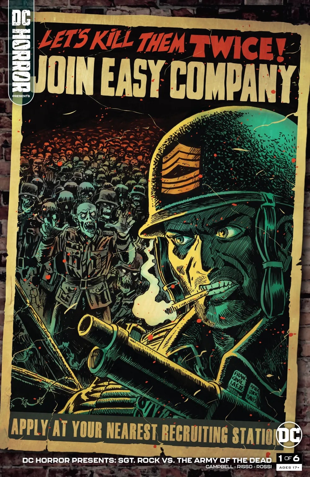 Berlin, 1944. The Nazis are besieged on all fronts by the Allied forces. Defeat is inevitable. But Hitler and his team of evil scientists attempt a last-ditch effort that may turn the tide of the war and rewrite history itself: a serum that resurrects their dead soldiers, stronger than they were in life, and sends them back into the battlefield. Now Sgt. Frank Rock and Easy Company have been dispatched into enemy territory to face off against the strangest, most horrific enemies they’ve ever encountered: Nazi zombies! Horror icon Bruce Campbell and comics legend Eduardo Risso bring you a terror-soaked Sgt. Rock tale like no other!