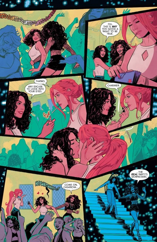 But they weren’t the only ones to put their names in the wall over the years, and suddenly queer heroes, villains, and civilians alike from across the DCU — the Question, Midnighter and Apollo, Harley Quinn, Green Lantern Jo Mullein, Bunker, Connor Hawke, and Blue Snowman among them — find them-selves spirited away to a strange alternate dimension that seems to provide everything they could possibly want… but at what cost?
