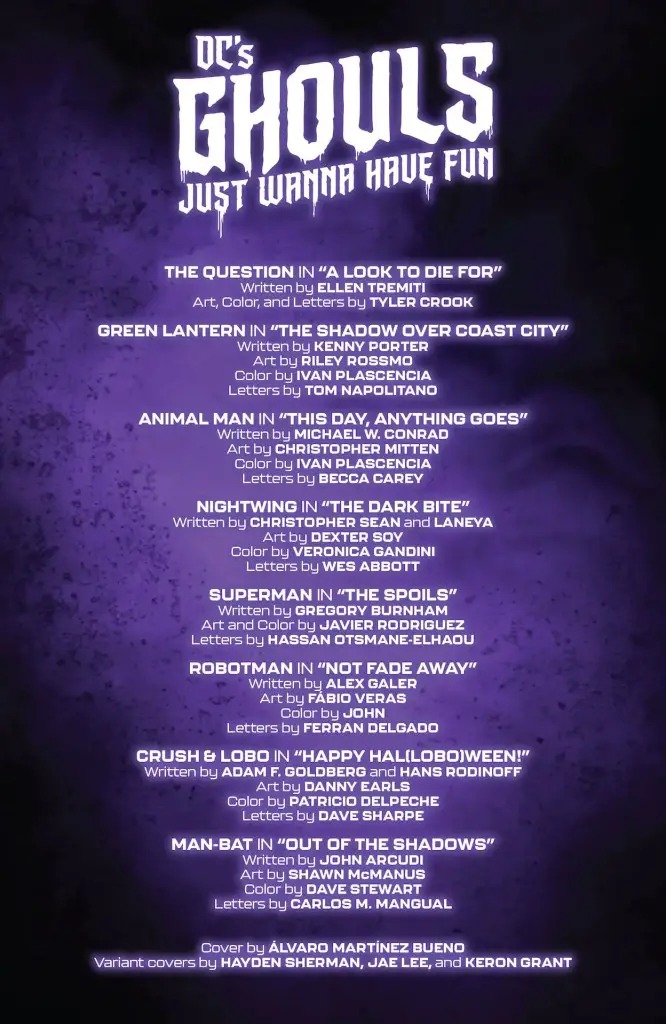 SKIN-CRAWLING STORIES OF THE DC GHOUL-IVERSE! Superman imprisoned by an unfriendly ghost! Man-Bat versus a werewolf! Mary Marvel and Dr. Psycho crashing a Halloween frat party! Plus: the Question faces horrific crimes of fashion; Robotman wrestles a ghostly glitch; Crush helps Lobo find the perfect costume; and Nightwing and Red Hood spend a frightful night in Blüdhaven, co-written by Christopher Sean, the voice of Nightwing from the Gotham Knights video game! The chills will last longer than your candy corn!