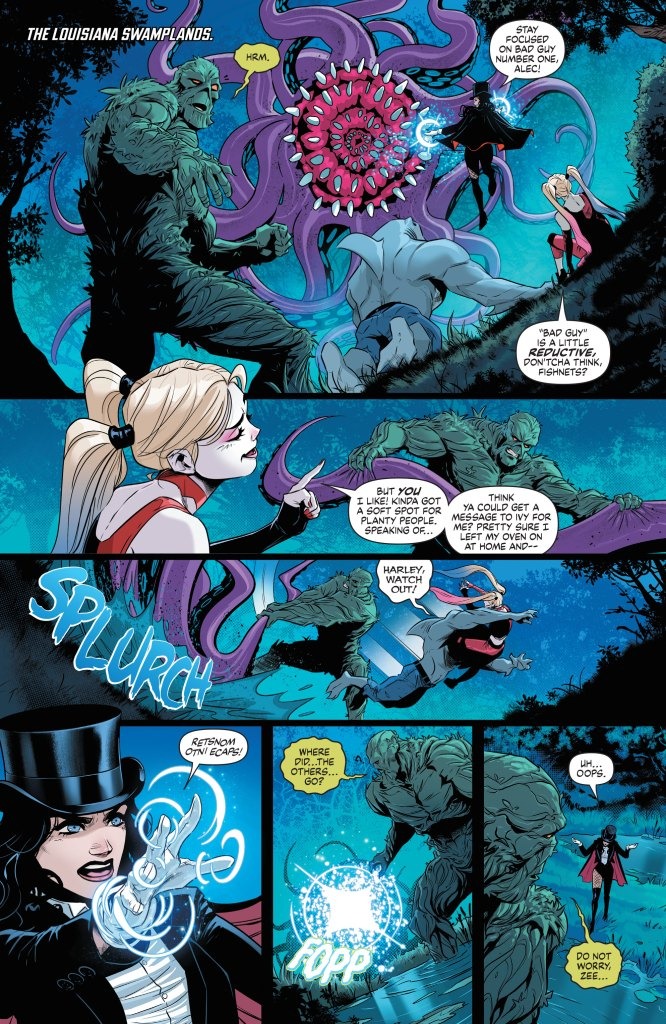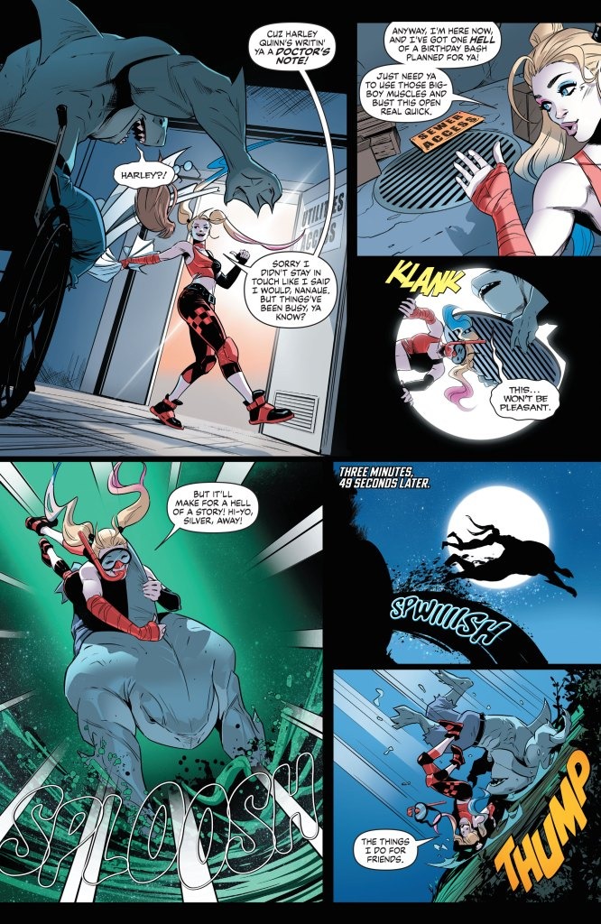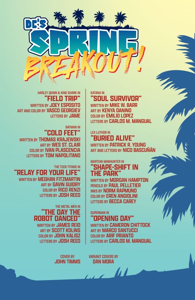 EIGHT ALL-NEW STORIES TO PUT A SPRING IN YOUR STEP! Spring has sprung! Flowers are blooming, bees are buzzing, Harley is breaking King Shark out of Belle Reve prison… all is right in the DCU as both heroes and villains face all sorts of different spring breaks. Breaking out of a coffin? Lex Luthor has that covered. Spring break training? Send in Superman! Breaking out of your shell? Batman and Mr. Freeze explore that possibility through a connection in their shared past. Breaking down a worthy adversary? Katana and her sword of souls might just be able to tackle that. And it wouldn’t be a spring break without a Teen Titans beach trip! All these and more in DC’s Spring Breakout!—eight breakout stories to put a spring in your step (is there a zit breakout story? You’ll have to read to find out!)