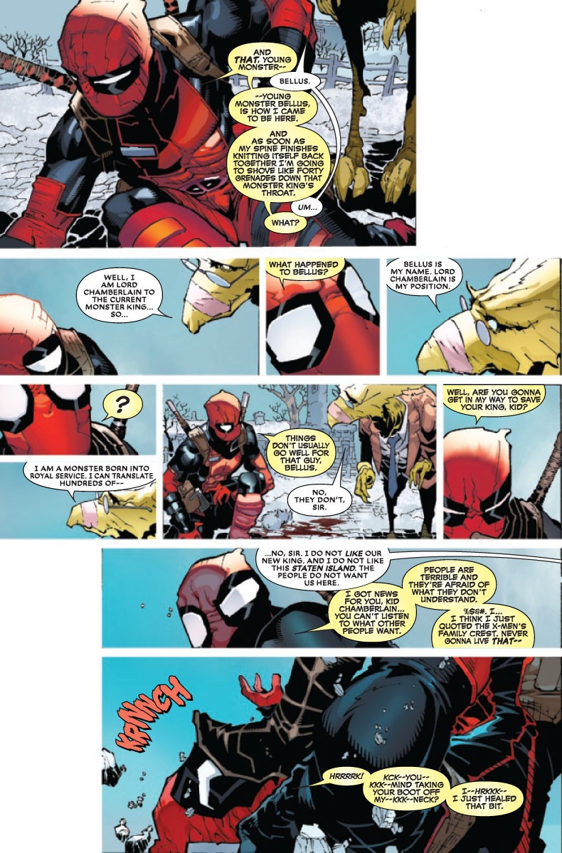 Deadpool’s newest mercenary job has him going after the King of Monsters, who has claimed a new kingdom for his monstrous subjects…on Staten Island! But you know what they say, when you come at the king, you better not miss! The Merc with a Mouth finds himself neck deep in political intrigue, monster law, and a monster hunter out for blood! It’s like The Crown but with even more swords and monsters! Can Deadpool’s smooth charisma and deft diplomacy allow him to keep his head, or will he be royally screwed?