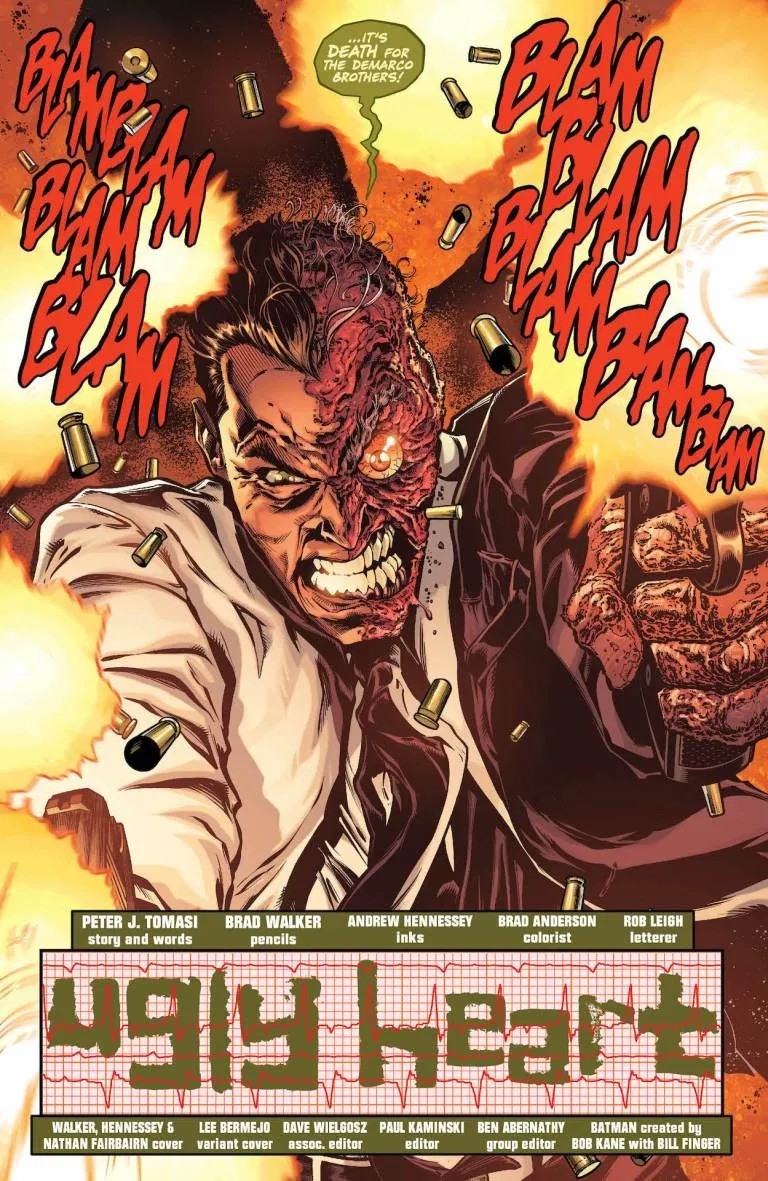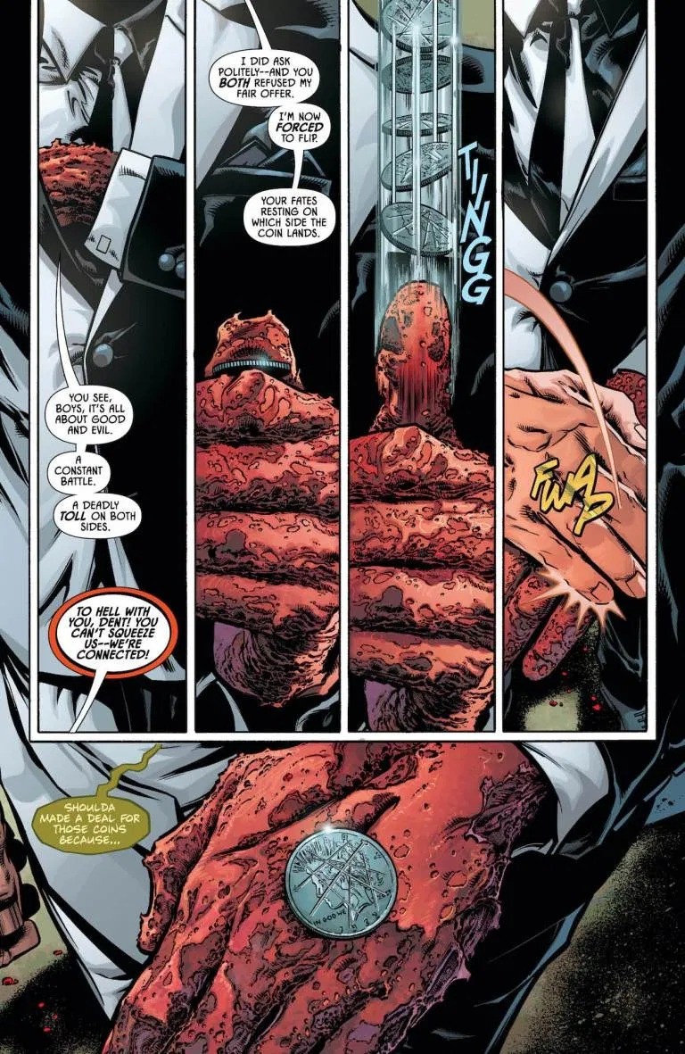 As Gotham City continues its rise from the ashes of “City of Bane,” some familiar faces have returned to keep Gotham City exactly where they want it: Two-Face is back. But this time, he’s recruited some like-minded individuals to help him in his cause. With an elite team of split-personality special forces at his side, Two-Face and Batman square off in what could be their final battle, as a new ally arrives to help the Dark Knight…Harvey Dent?!