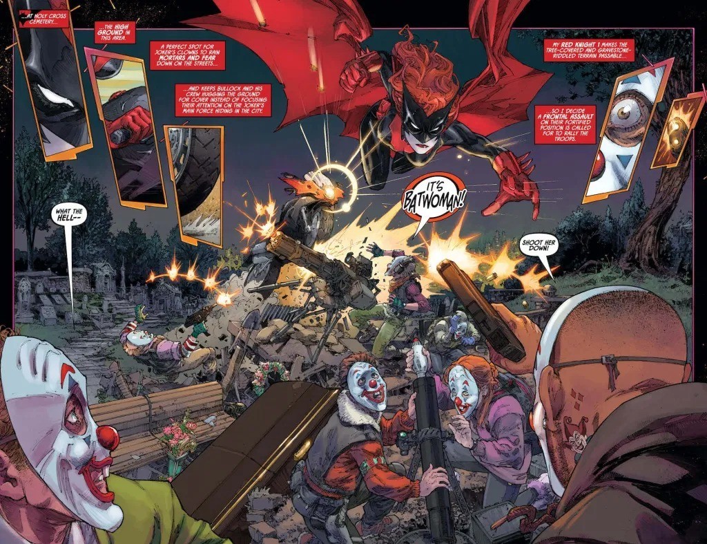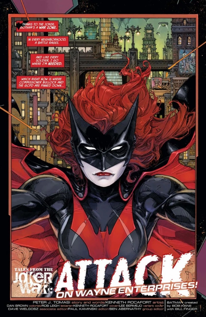“The Joker War” explodes with an assault on Wayne Enterprises! The Joker has taken control of Waynetech R&D-and with it, all the weapons hidden in its sublevels-plus Lucius Fox as a hostage! The Joker and his clown-masked henchmen are now using Wayne Enterprises as an armory, using sophisticated 3-D printers to produce weapons to rule Gotham City…but Batman and Batwoman might have something to say about that. It’s all-out action in this nonstop issue!