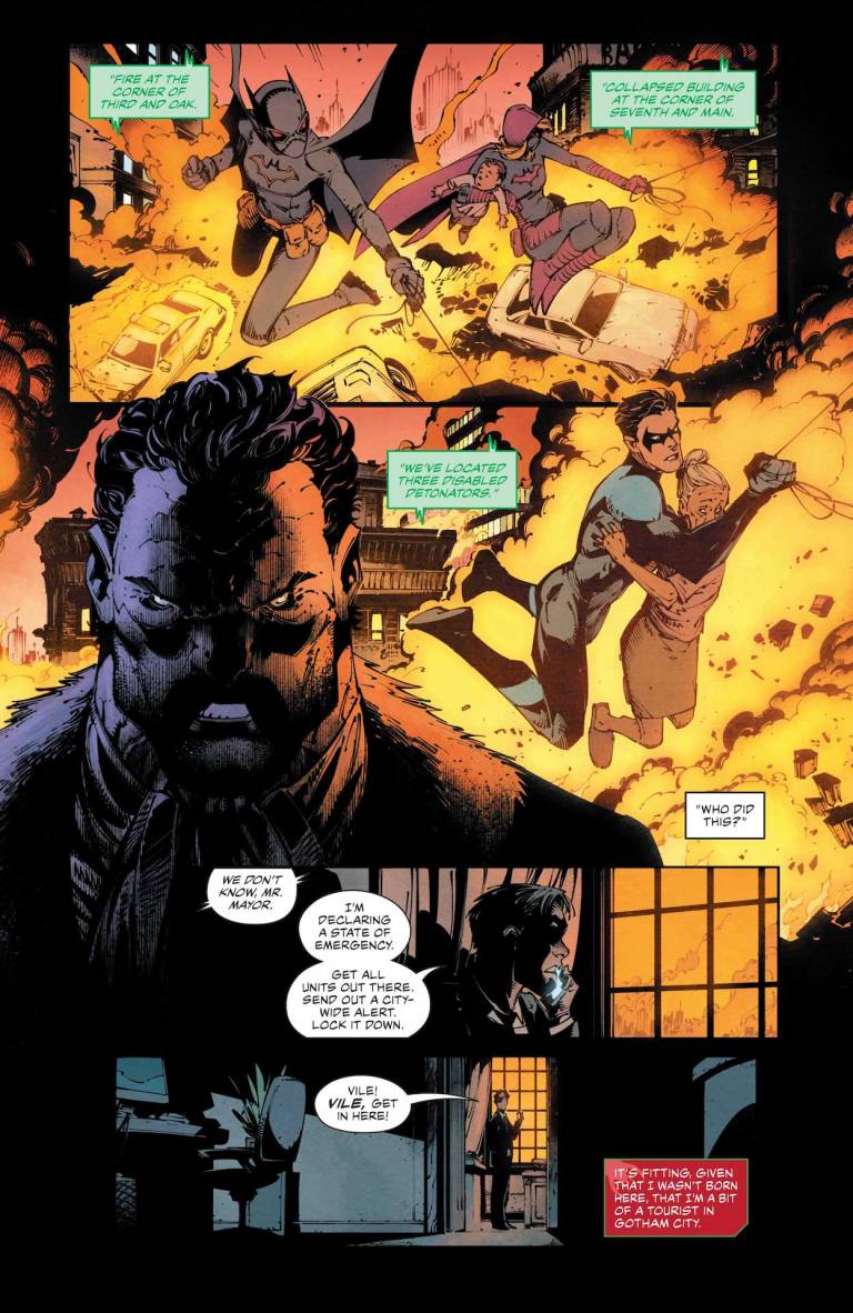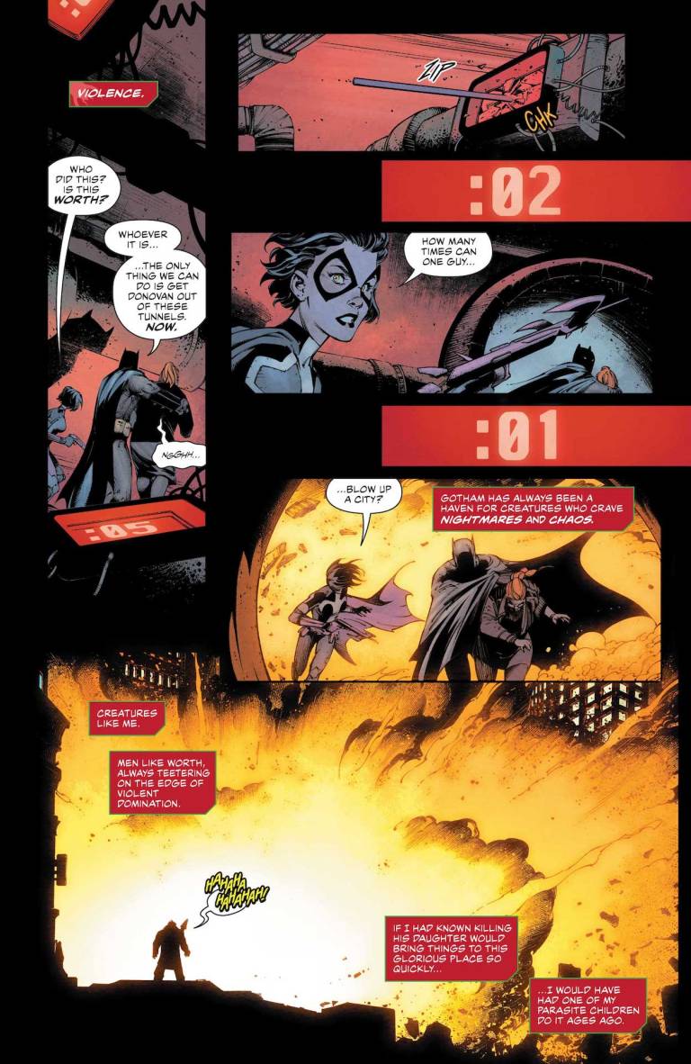 Looks like someone brought a batarang to a bazooka fight! As the explosive battle royal between Batman and Mr. Worth roars to a climax, Huntress is on the trail of the other major threat plaguing Gotham City: violence parasite Vile! By the end of this battle, one character will be dead, one avenged, and even more holding on for dear life!