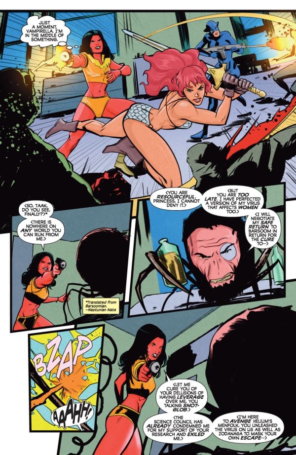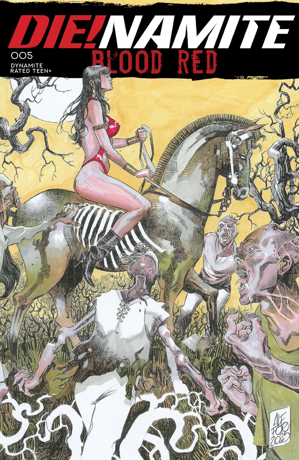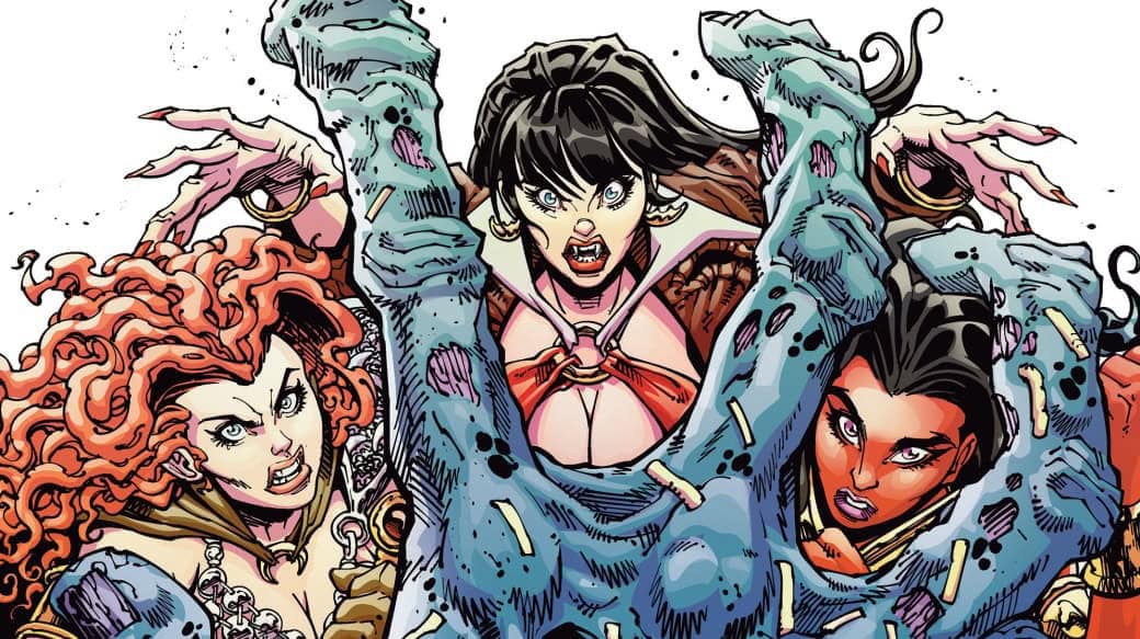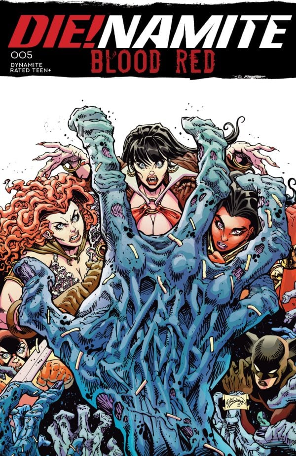 TODAY’S FORECAST: ZOMBIES, ZOMBIES, ZOMBIES! In this sanguinous saga’s gripping finale, the ultimate fate of Sunset City hangs in the balance as the female furies of Mother Earth take on the full might of Martian mayhem! Red Sonja, Vampirella, Purgatori, and any other surviving femmes fatales face betrayals, reversals, and impossible odds at every turn as they race to end the Deadman plague once and for all! Contagion carriers FRED VAN LENTE and MARCO FINNEGAN spread their spores far and wide with Die!namite: Blood Red #5 — featuring spectacular secondary infections from EJ SU, ALESSIO FORTUNATO, EMANUELE ERCOLANI, and WILL ROBSON!