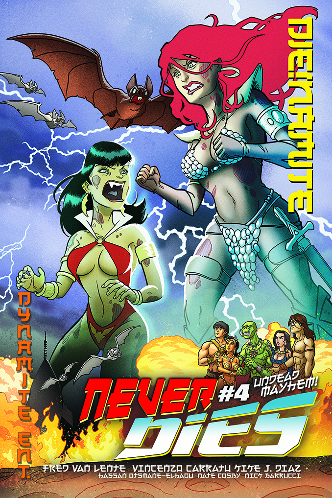 The penultimate issue of the series that critics are saying “has zombies in it”! RED SONJA glows and fights zombies! VAMPIRELLA bites zombies! TARZAN wears very little clothing whilst hitting zombies! Other things happen with zombies too! It’s a zombtastic zombiforous zombfest, courtesy of FRED VAN LENTE (Marvel Zombies) and VINCENZO CARRATU (DIE!namite)!