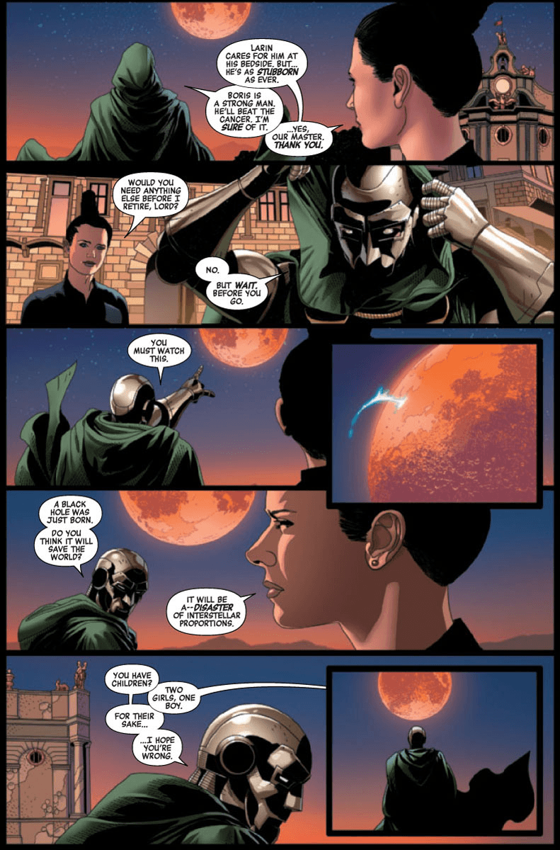 Victor Von Doom – scientist, sorcerer, disfigured face, twisted soul – has been spending much of his time warning against a trillion-dollar global effort to create the first “artificial” black hole. Wrestling with visions of an entirely different life…a better future…DOCTOR DOOM finds himself at a crossroads. (what is he questioning?)