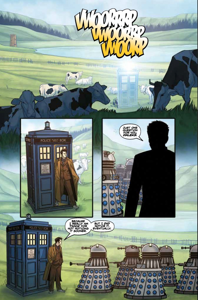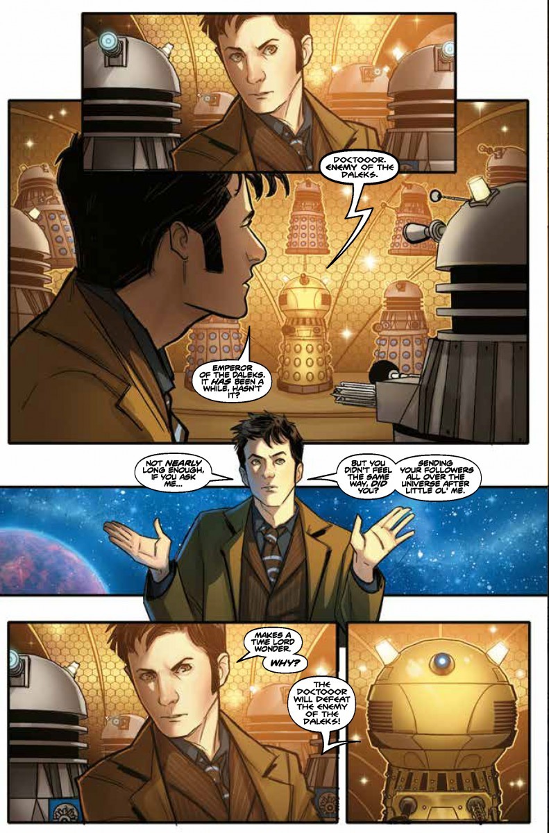 A thrilling new adventure for the Tenth Doctor (as played by fan-favorite David Tennant) that sees the shocking return of his deadliest enemies: the Daleks! But things aren’t what they seem – time is all wrong, and something is coming that terrifies even the Daleks… The first of two oversized issues kicking off the BBC’s highly anticipated multi-platform Doctor Who epic, Time Lord Victorious!