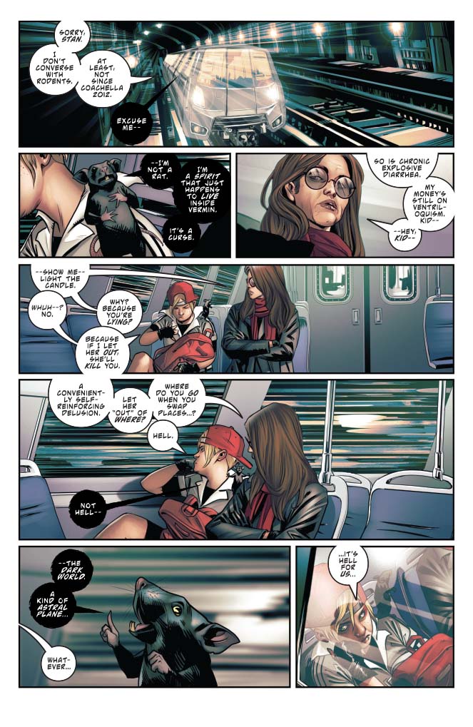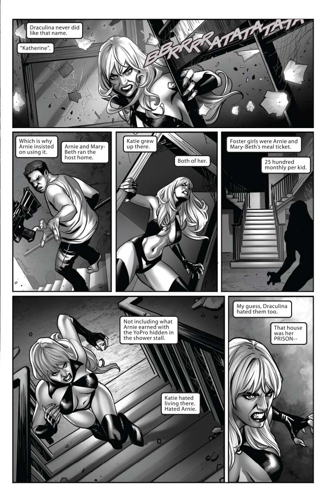 Draculina’s secret origin begins in an ancient tower more than four centuries ago where her mother Lilith, desperate to free her people from ruthless oppressors, made a deal with the demon Belial to bear his children. Now, as Katie—Draculina’s human alter-ego—lays dying, the mystery of Draculina’s two lives is revealed as two sides of the same woman struggle for control. Meanwhile Belial, now retired from the demon business, has been alerted to Draculina’s presence in this prime reality, and seeks to regain control over his rebellious stepchild.