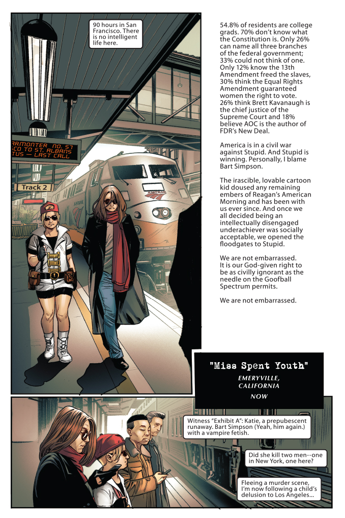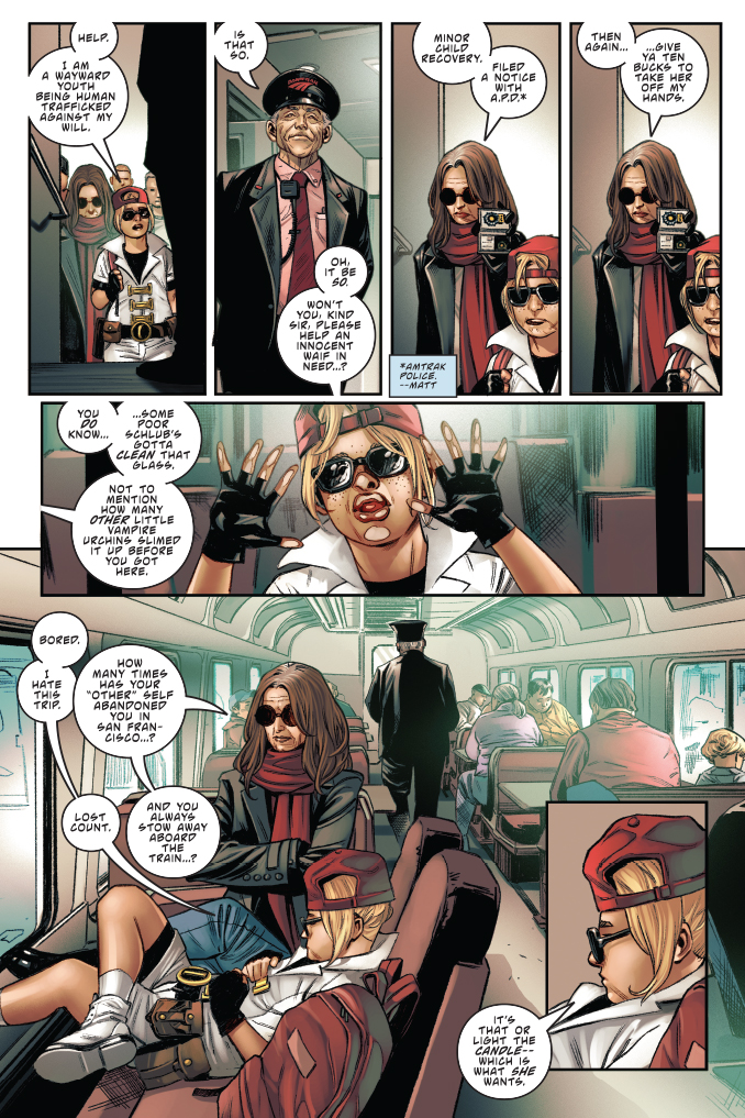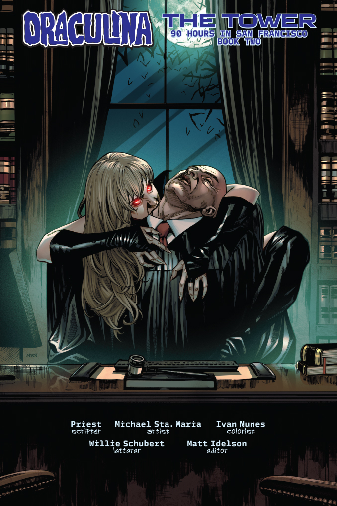 Having been tipped off to Draculina’s arrival in our plane of existence, the demon Belial-who stole Draculina from Vampirella’s and her mother Lilith when Draculina was small-sets out to reclaim his lost child, taking in the preteen Katie, Draculina’s snotty alter ego, for the strangest father’s day in history. Meanwhile Draculina continues assembling pieces of the Daemon Periapt, an ancient talisman capable of killing Belial, while she struggles to break the demonic bond linking her to the child Katie.