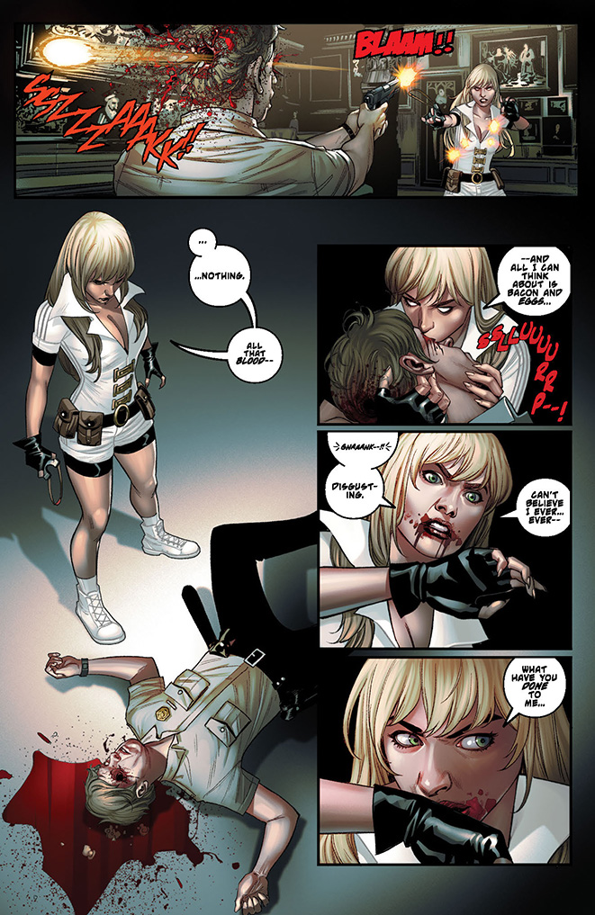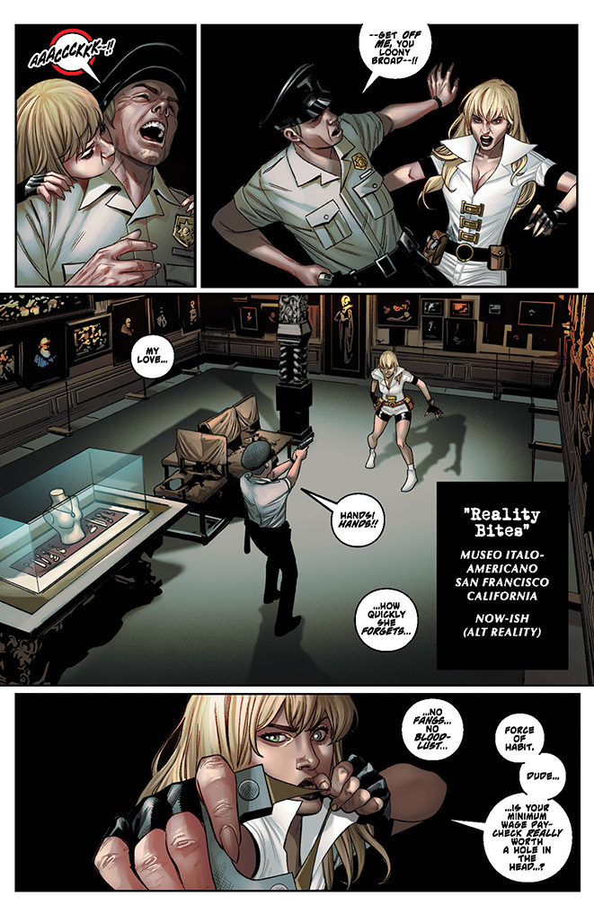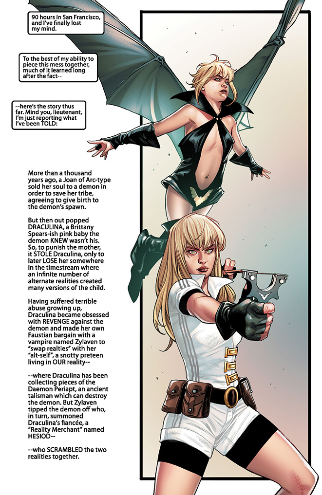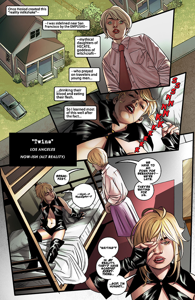 An enigmatic faerie named after an ancient Greek poet has twisted the multiverse, exchanging the fates of Draculina and her alternate reality “self” Katie, and forcing Draculina to experience a vulnerable humanity, with all its emotional consequences, for the first time in her long, immortal life. Meanwhile, Katie has gained everything she has ever wished for – like all the powers of a full vampiri, including the bloodlust! But the reality of having supernatural power quickly crushes her childhood fantasy as, ravenous for blood, Katie’s innocence hangs in the balance!