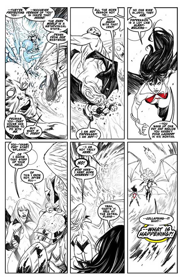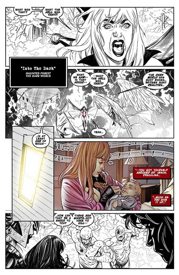 “Blood Simple” reaches its crimson climax with Draculina and Vampirella fighting for their lives within the astral plane known as “The Dark World,” where Draculina also confronts a shocking vision of her future. Meanwhile, in the “real” world, Draculina’s two “alternate selves” — Katie, the preteen Vampirette, and Lilith’s protégé, Victory — find themselves caught up in a literal holy war between demons and angels. Which Draculina (if any) will survive? Find out this August!