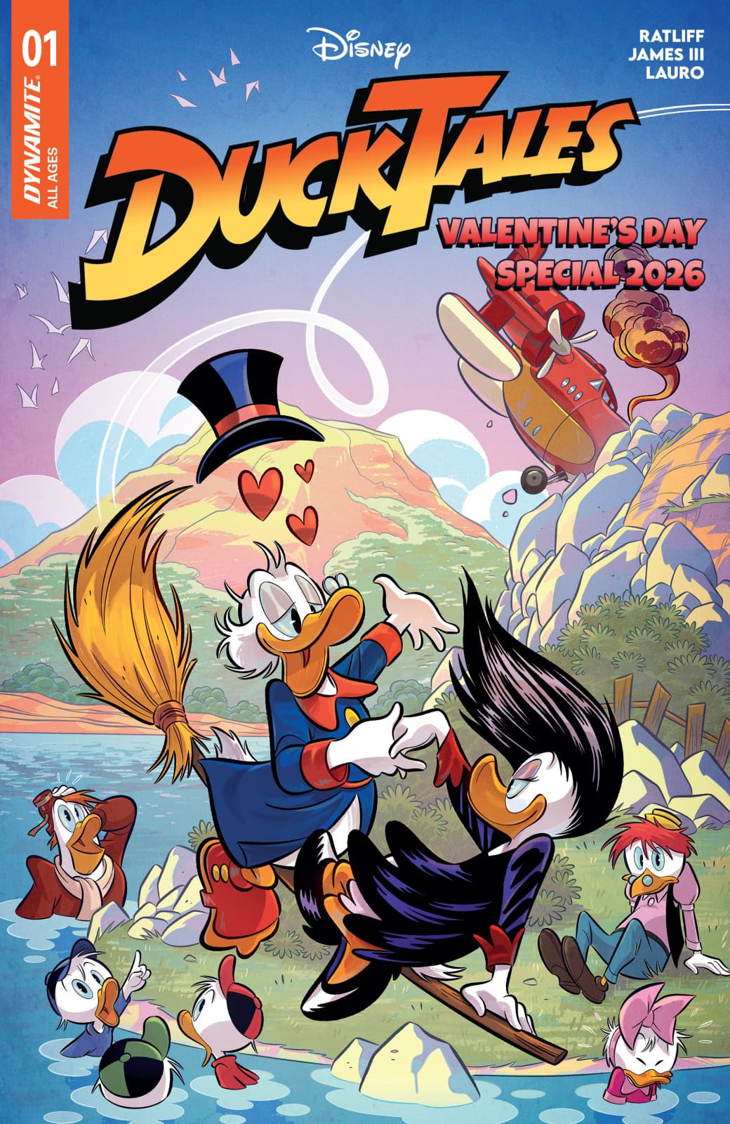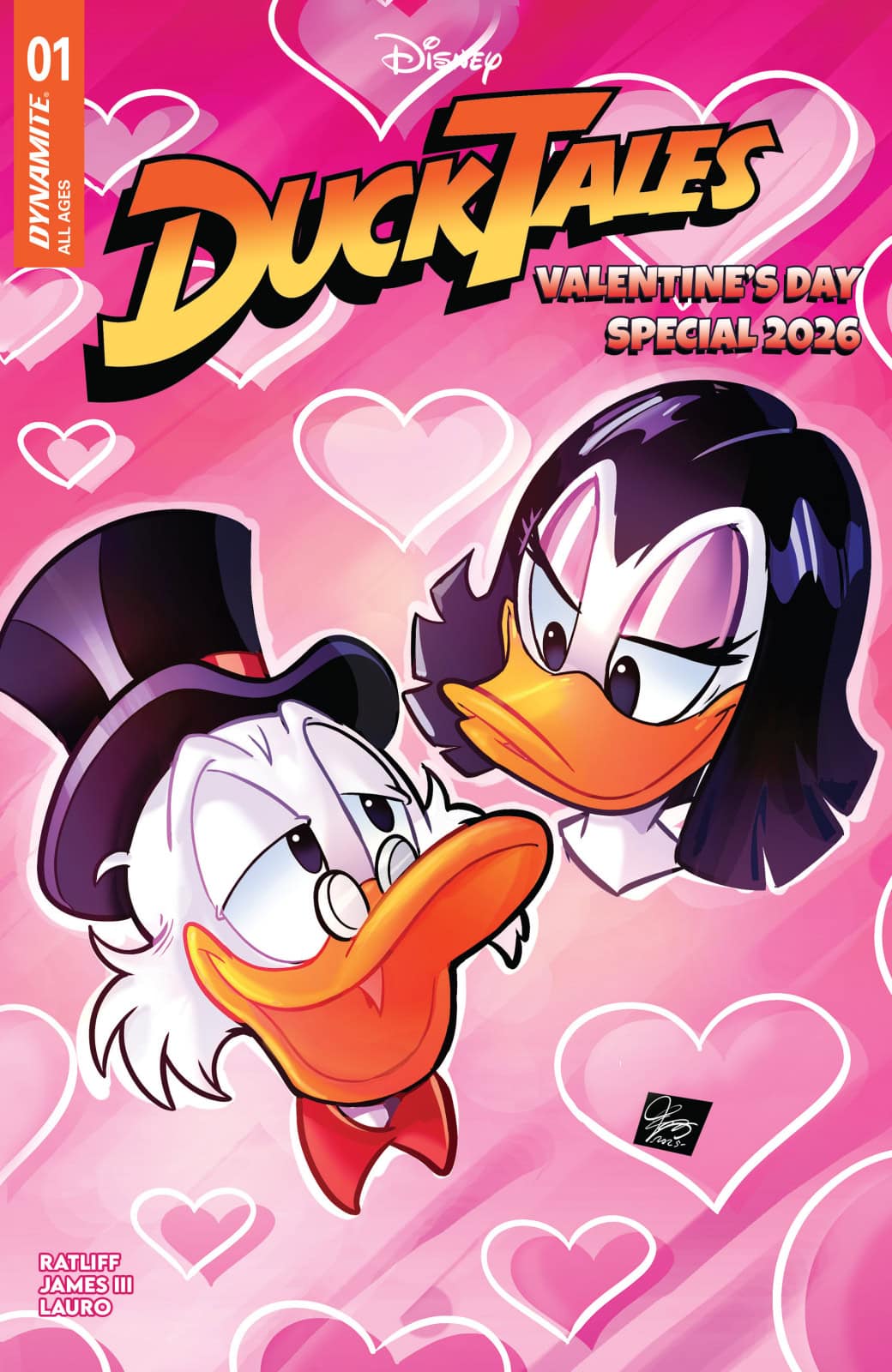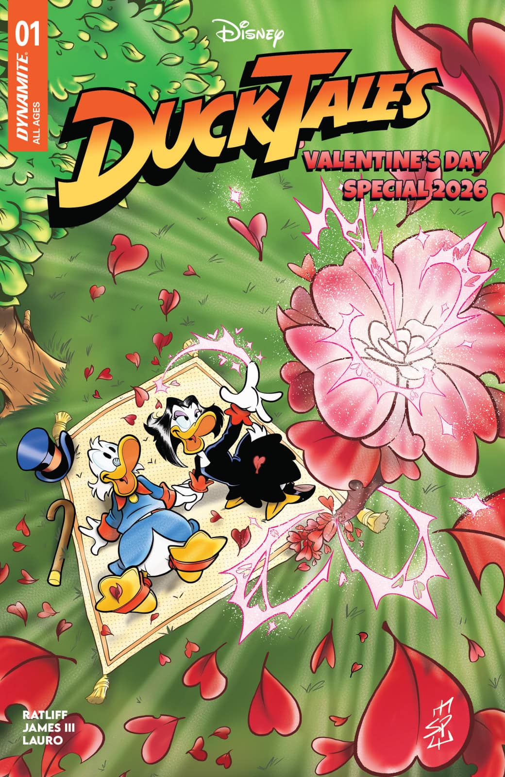 ALL’S FAIR IN LOVE — AND SORCERY! The World’s Richest Duck didn’t accumulate his uncountable kajillions by being anyone’s fool — and no one is more foolish than a fool in love! So when February 14th rolls around and the unsolicited cards and presents from charlatans and two-timers start piling up on his desk, Scrooge McDuck has multiple levels of precautions in place to neutralize all of their nefarious schemes. One age-old adversary, however, has forged a plan to bypass all of the McDuck Money Bin’s famed defenses and secure the ultimate prize: Uncle Scrooge’s precious Number One Dime! The indefatigable Magica De Spell just needs to get close enough to Scrooge to cloud his mind with the rare Forget-Me-Do flower. But when the single-minded sorceress is caught in the same memory-fogging spell as her quarry, all bets are off — and romance is suddenly in the air! Having forgotten their long history of enmity, could these rival ducks turn into cooing love birds? Find out in the rose-colored pages of the DuckTales Valentine’s Day Special 2026, written by Stitch co-authors CONNOR RATLIFF and JAMES III and lovingly illustrated by LIBERO ERMETTI! This heartfelt 40-page one-shot also features a Cupid’s quiver’s worth of covers from ERMETTI, NICOLETTA BALDARI, CIRO CANGIALOSI, and STEFANO PORCU!