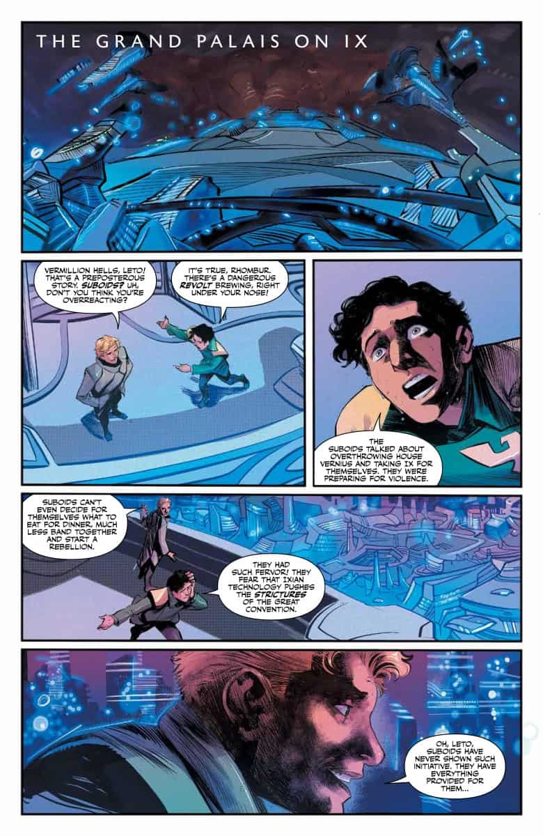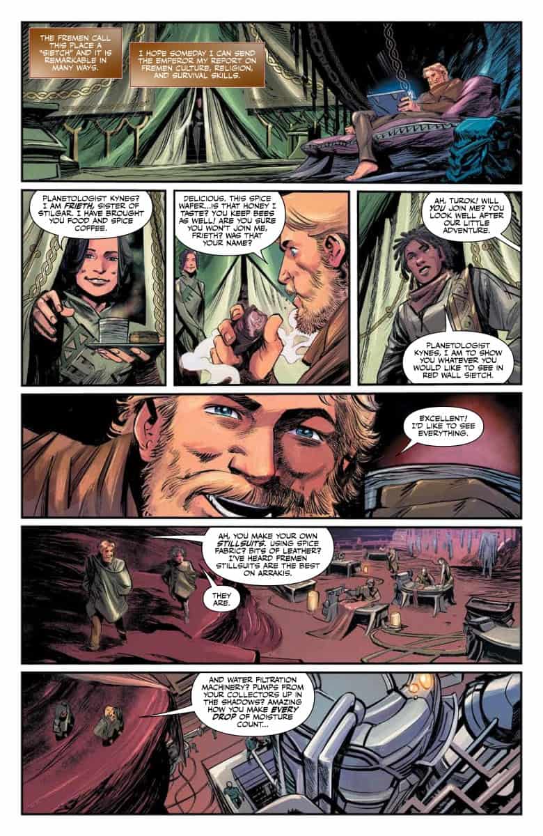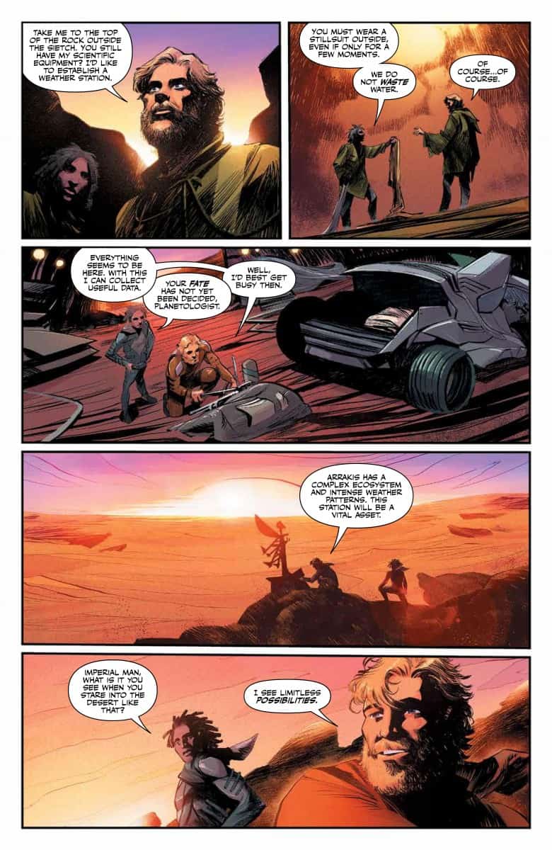 Leto brings news of the revolt brewing on Ix, but the city’s leaders make a decision that may threaten everyone…. while Crown Prince Shaddam plots to overtake it. Meanwhile, Pardot Kynes begins spreading his edenic vision to terraform the desert planet of Dune into an oasis even as the native Fremen raise suspicions about his motives…and if he can truly accomplish his goals.