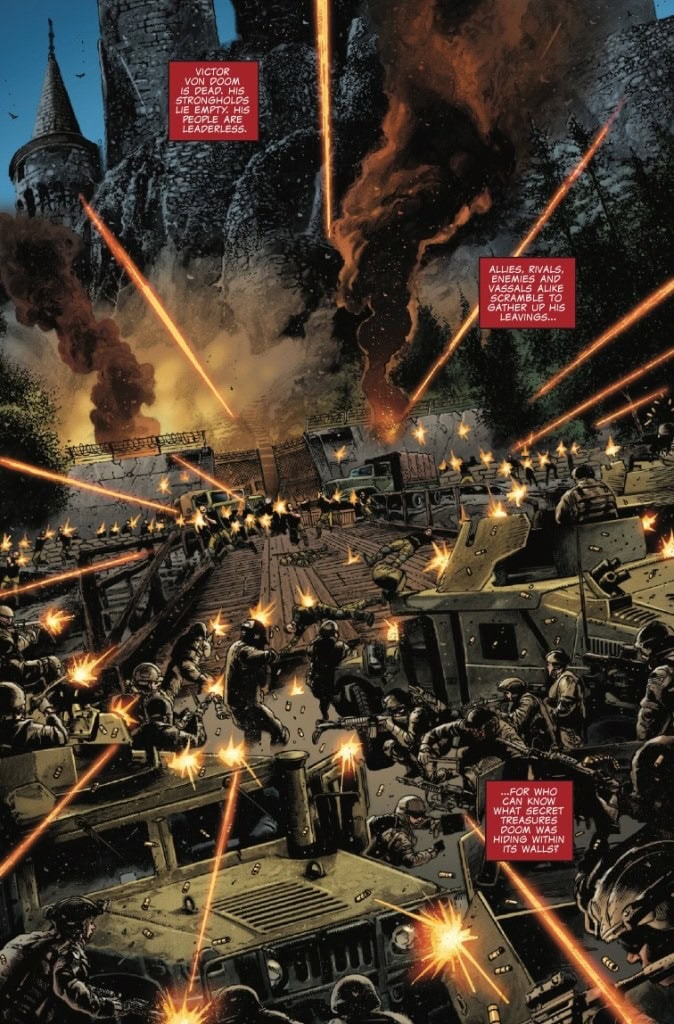 In the aftermath of ONE WORLD UNDER DOOM, with Doom’s castle empty and masterless, the superpowers of the world race to claim and control the untold power and technology that await inside. But when an explosion sends them all plummeting into a dungeon labyrinth that none of them knew was there, what began as an arms race becomes a terrifying game of survival. Who, if any, will survive? And what horrors lie within the DUNGEONS OF DOOM?