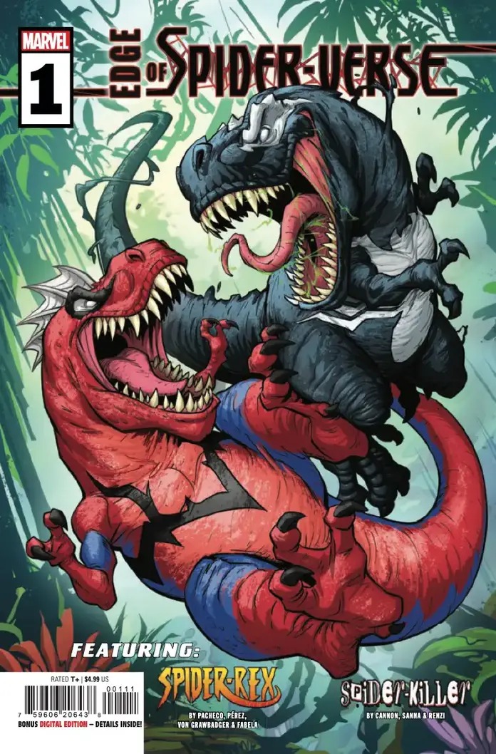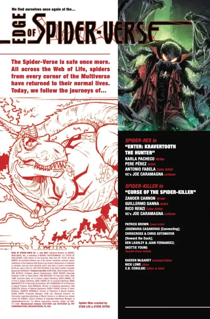 INTO THE OTHER EDGE OF THE SPIDER-VERSE! SPIDER-REX returns and faces the VENOMSAURUS! PLUS—WHO IS THE SPIDER-KILLER?! Zander Cannon introduces the world to the scariest Spider-Character EVER CREATED!!! Bringing your favorite breakout characters back, as well as introducing brand new Spiders who will blow your mind!