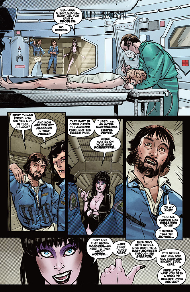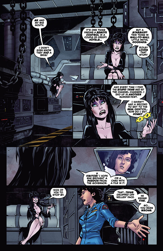 ELVIRA BOARDS A DOOMED SPACECRAFT BOUND FOR THRILLS, CHILLS, SPILLS, AND BAD JOKES!