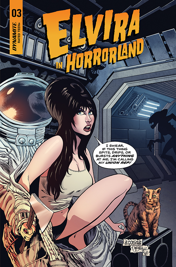 In space, no one can hear your goofy sex puns! The Mistress of the Dark finds herself “alienated,” as her trip through the Multiverse of Movies lands Elvira aboard a certain doomed starship with a certain deadly stowaway. (No, it’s not the cat.) Come for the horror comedy, stay for the franchise fatigue in this Promethean effort by writer David Avallone (Elvira Meets Vincent Price, Bettie Page: Unbound) and artist Silvia Califano (Star Trek, Judge Dredd.) All these fun, thrills and spills, plus a series of amazing covers by returning artists Dave Acosta, John Royle, series artist Califano, and an amazing Elvira photo cover you won’t want to miss!