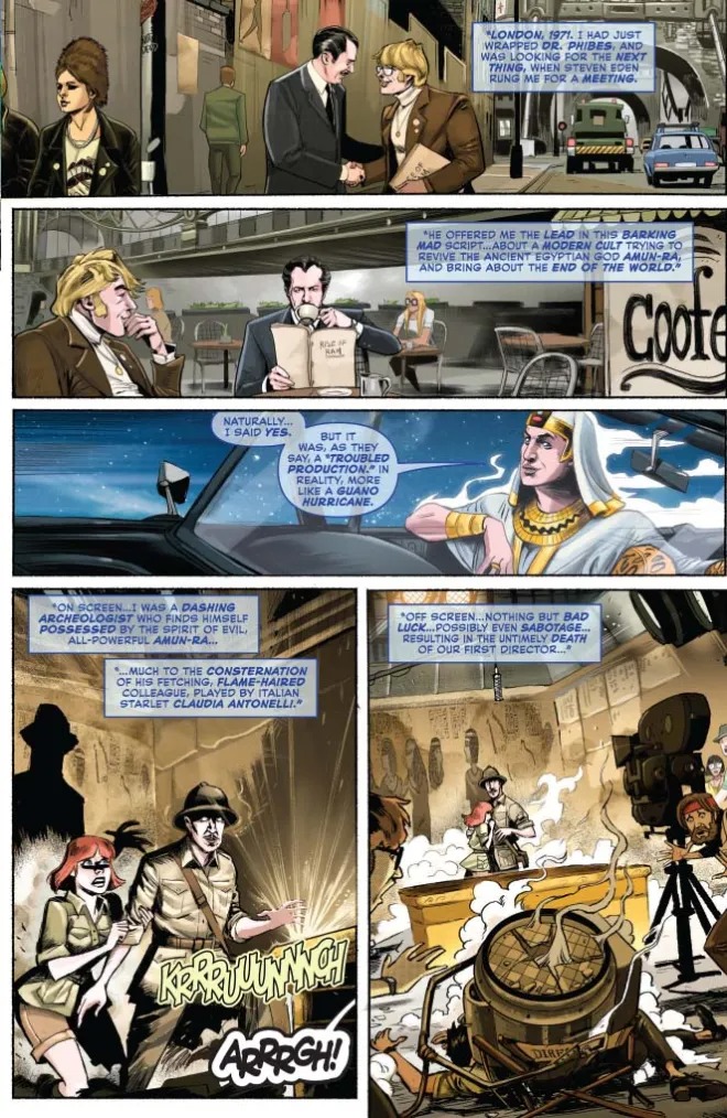 Elvira and the Ghost of Vincent Price continue their quest to find a lost cult movie… AND save the world from the wrath of an awakened Egyptian god. Their journey takes them to the crumbling country estate of a reclusive film director and his movie-star bride, but things go all Dr. Phibes before you can say House of Usher! Come for the sexy horror, stay for the terrible puns and movie trivia! From writer David Avallone (Bettie Page, Twilight Zone: The Shadow) and artist Juan Samu!”