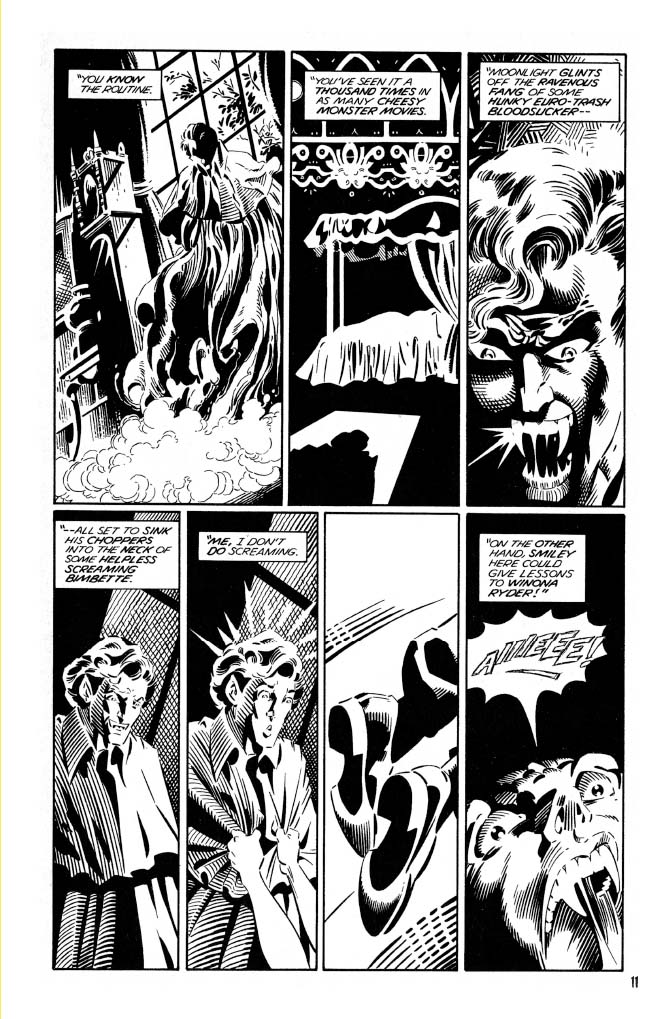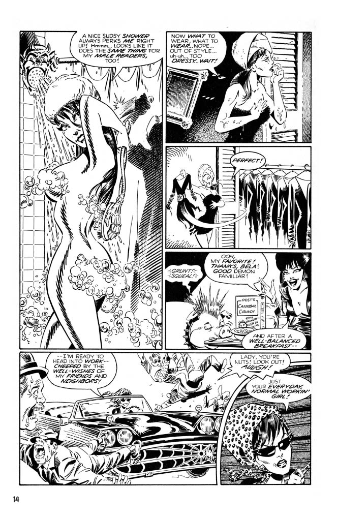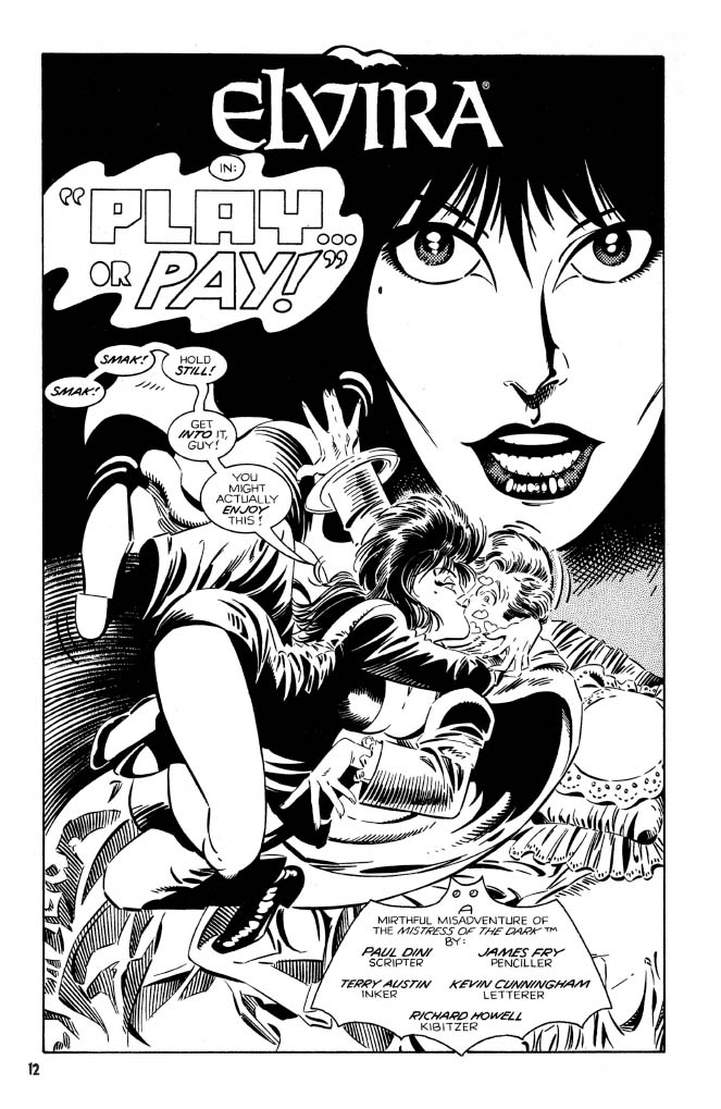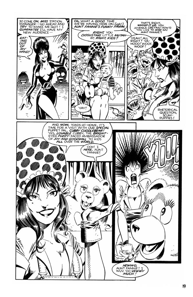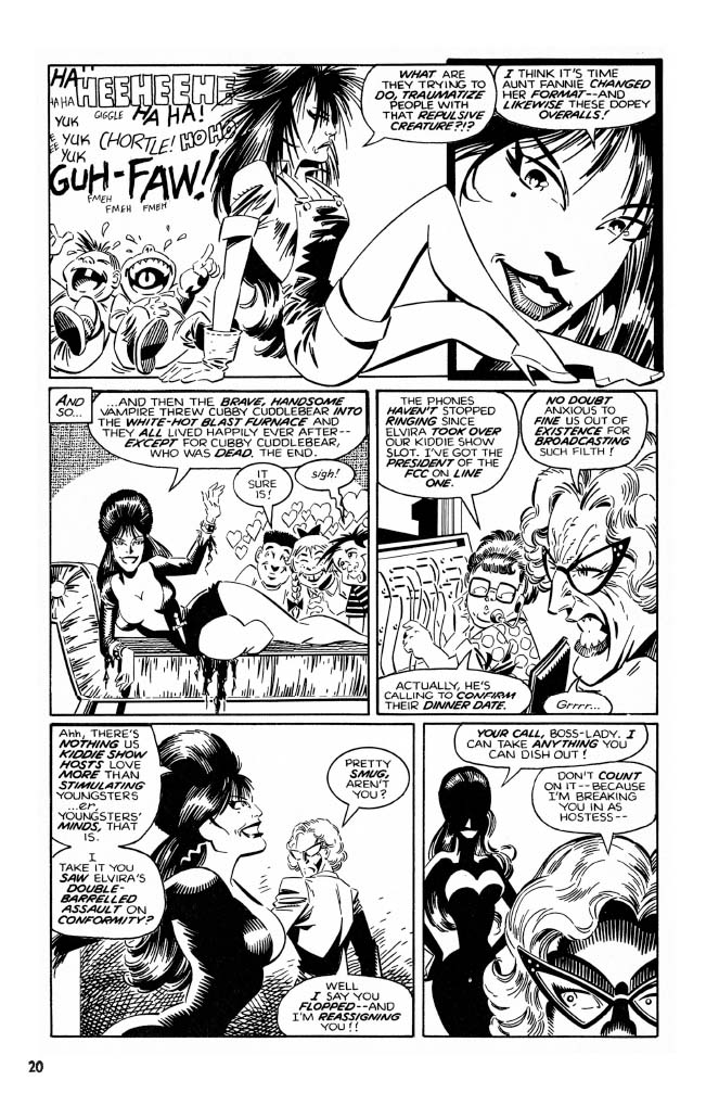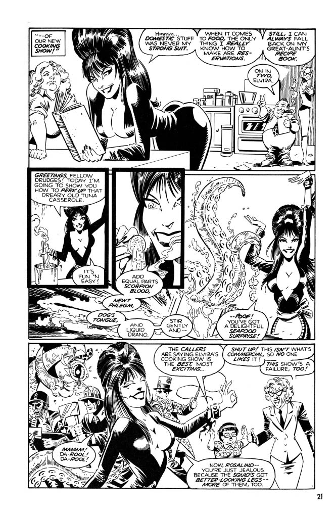 A bountiful bevy of talented creators contributed to these adventures. Known for his love of the macabre and the flirty, Paul Dini of Batman fame lent his hand. While this first volume also compiles all of the plentiful pages written by Kurt Busiek (Avengers, Astro City). Claypool head honcho Richard Howell (Vision & the Scarlet Witch) and Frank Strom also contributed writing. While on the art side, Tom Simonton is beloved by Elvira fans for his early contributions to the series, as well as John Heebink. X-Men fans will thrill to the lines of Dave Cockrum on stories, and Dynamite’s Vampirella fans will love to see Louis LaChance. Other stars inside include Dan Spiegle, Fred Hembeck, and Neil Vokes.