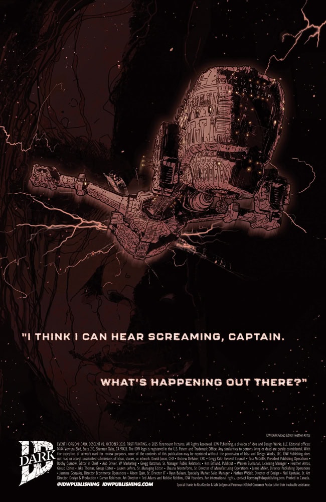 IDW Publishing’s official prequel to the cult classic sci-fi horror continues next week with the release of Event Horizon: Dark Descent #2, and you can get a sneak peek at the terrors that await with the official preview below…