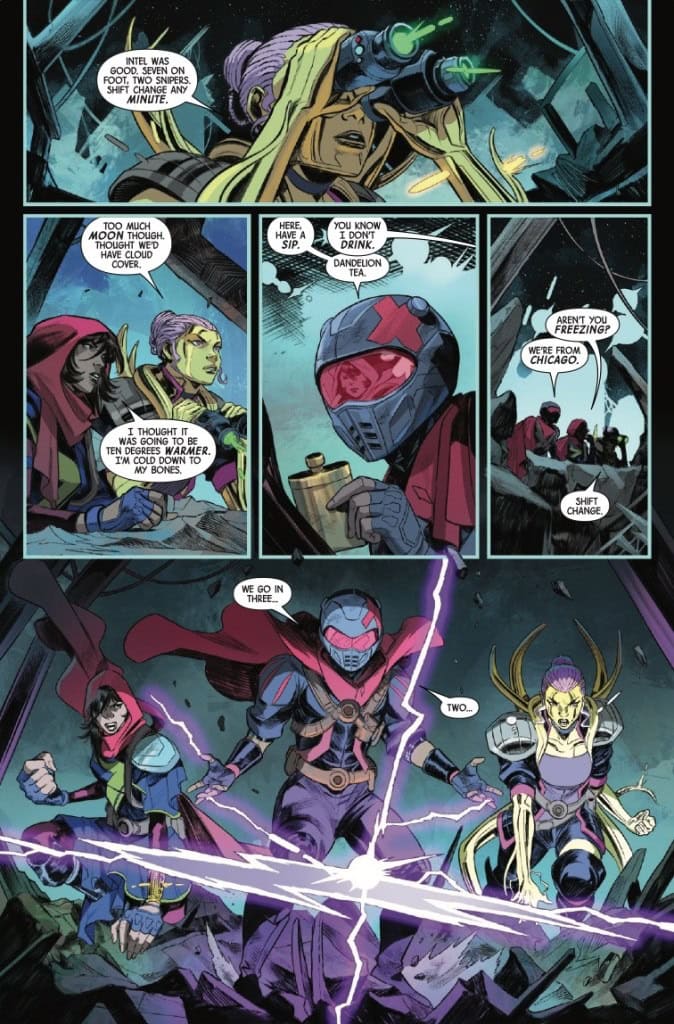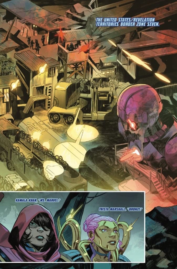 X YEARS LATER, like the fallen and reassembled United States, the new team of MS. MARVEL, BRONZE, MELEE and RIFT rises! They have seized control of the Mississippi River waters that divide mutantkind from the rest of humanity. Feared and powerful, their guerrilla tactics keep them in control — until a high-stakes mission to extract a valuable asset threatens to tear them apart. Can they hold together when everything’s on the line?
