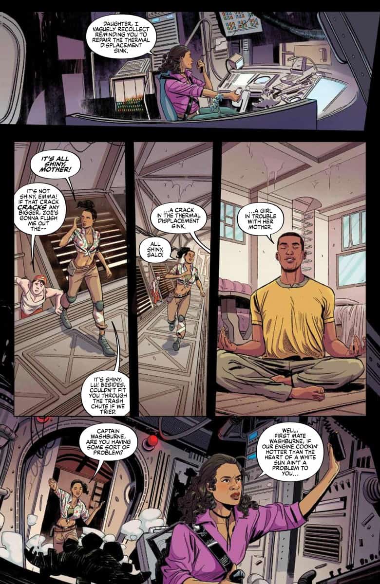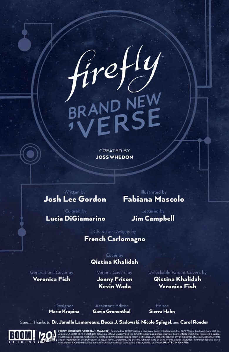 NEW SERIES. Set 20 years after the events of Firefly, Serenity soars the ‘Verse once again with a new captain – Emma, the daughter of Wash and Zoë! The old crew of Serenity has gone their own way and now Emma is working to prove herself to Zoë, alongside a new crew of castaways and misfits just trying to stay afloat. But when Serenity takes a job from a familiar face, they discover that their new, living, breathing cargo is far more than they bargained for…and might bring them into conflict with Alliance once again! Josh Lee Gordon (Firefly: Bad Company) and Fabiana Mascolo (Yasmeen) begin a new era for Joss Whedon’s Firefly with First Appearances of an all new cast, new adventures and shocking new surprises!