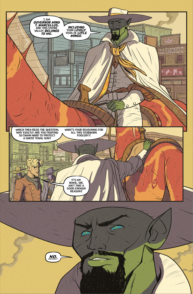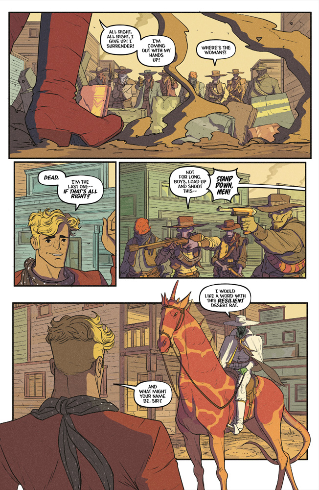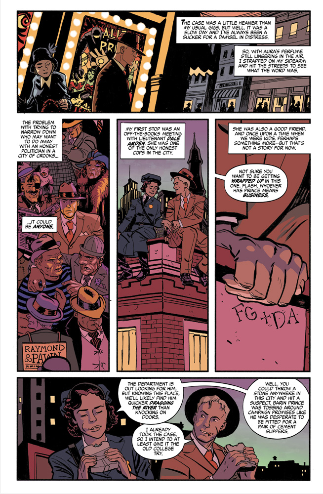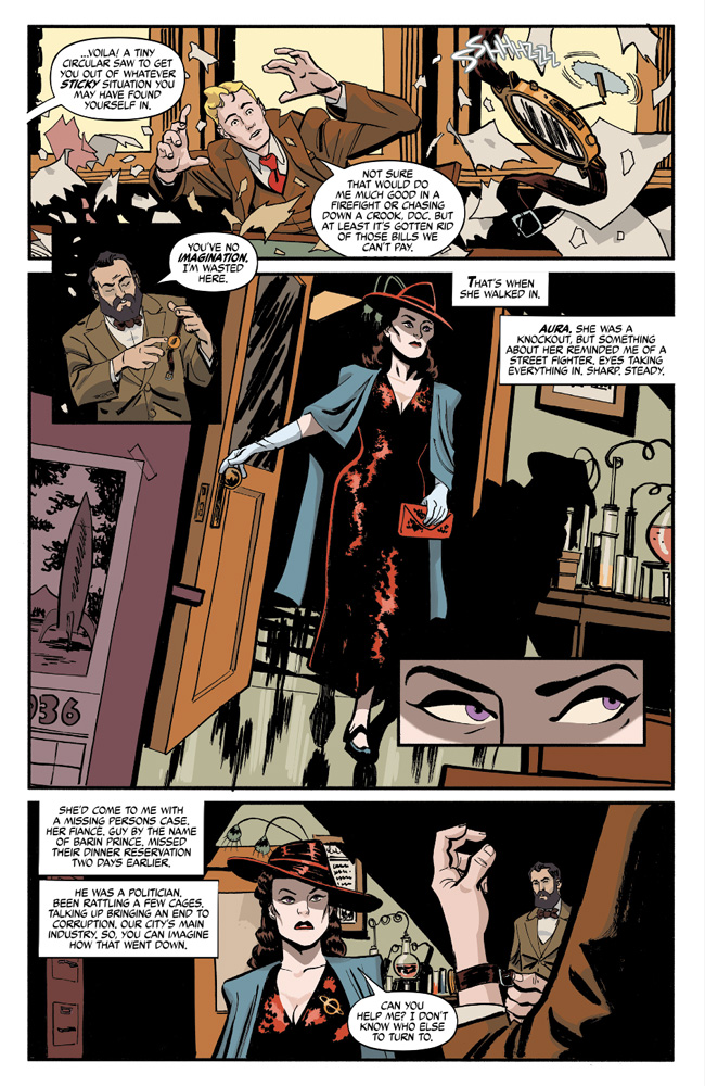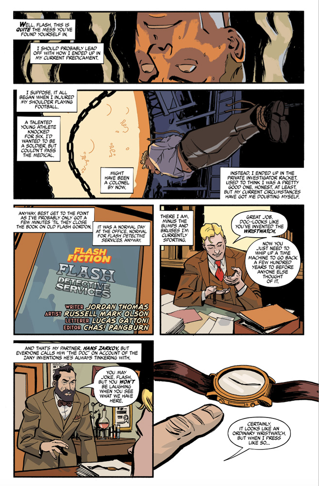 This issue also features two “Flash Fiction” stories–wholly original takes on the classic character and his companions in new genres and settings. “The Battle of Little Mingo” is a western tale trading stardust for tumbleweeds. Meanwhile, crime runs amuck in”Flash Detective Services!”