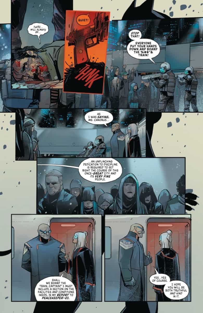 Masked vigilantes have been deemed illegal, and the Magistrate has commandeered a bullet train to take those they’ve captured to a reformation facility-and filled the rest of the train with innocent children! Catwoman is hellbent on ensuring it never reaches its destination. Armed with a new magnetic suit, assisted by her trusty band of Strays, and featuring Catwoman’s new protégé, she must pull off the impossible: a train heist where she steals…the train itself! But Selina isn’t the only person aboard who has plans for this train and its most unexpected passenger!