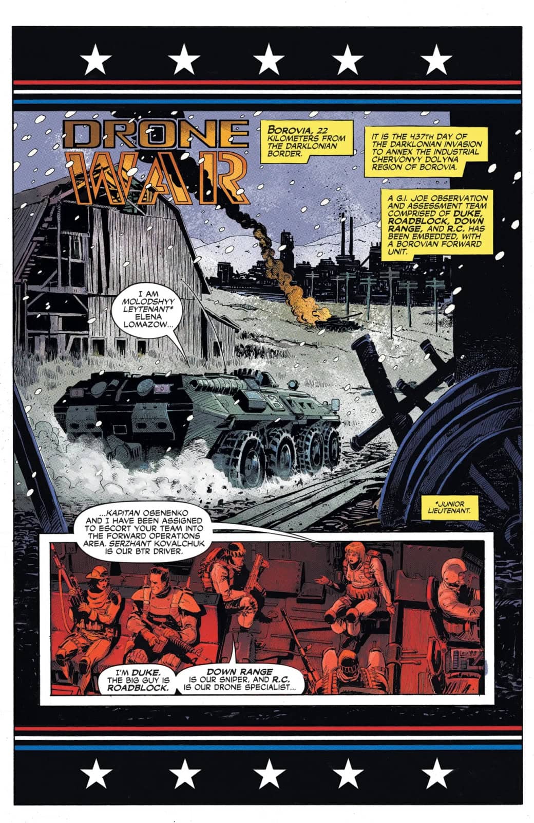 SPECIAL 325th ANNIVERSARY ISSUE! Two all-new Joes make their FIRST APPEARANCE as Duke and Roadblock lead a dangerous cover op into Borovia. A New Era For G.I. JOE: A REAL AMERICAN HERO starts here!