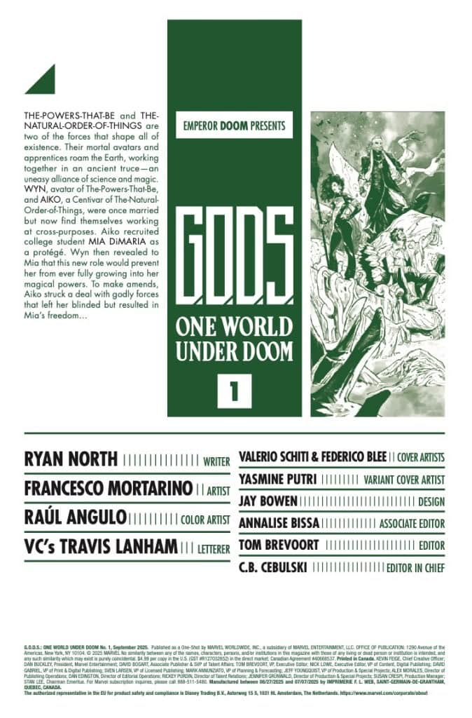 G.O.D.S. One World Under Doom #1 is out on Wednesday, July 30th 2025.