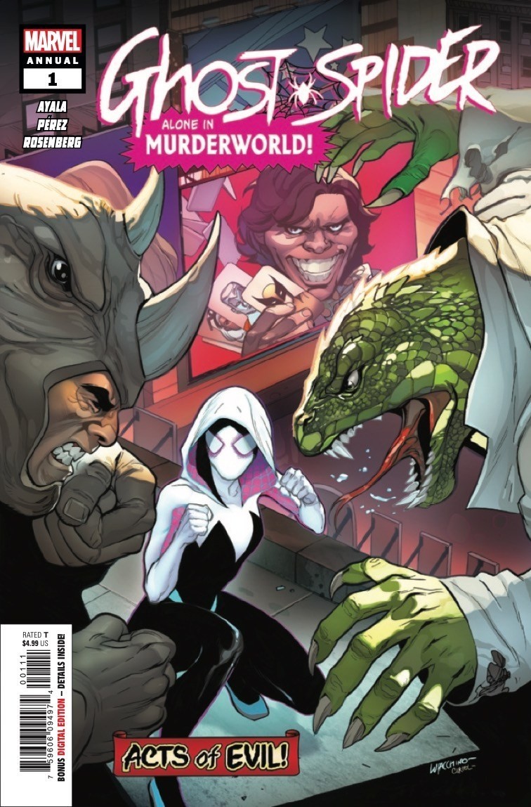 GHOST-SPIDER BATTLES FOR HER LIFE IN MURDERWORLD! Gwen Stacy is trying to balance her social life with her hero life in the 616…but what will she do when she comes face-to-face with Arcade’s Murderworld?! It’s a tower of terror as Gwen takes on some of the most classic – and DEADLY – villains of the Marvel Universe! VITA AYALA (SHURI, PRISONER X) and PERE PEREZ (UNCANNY X-MEN, ROGUE & GAMBIT) bring the Ghost-Spider action in the Mighty Marvel Manner!