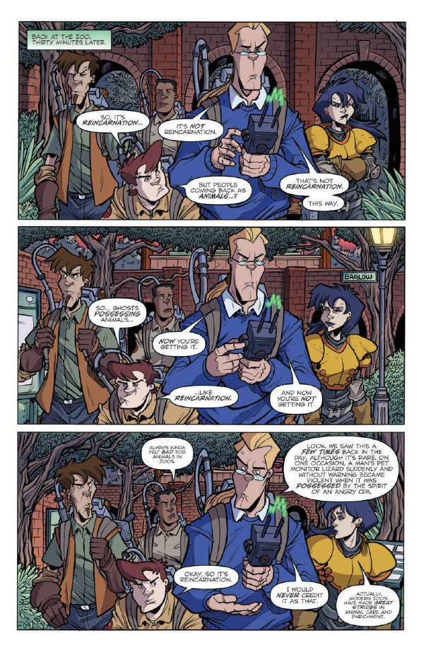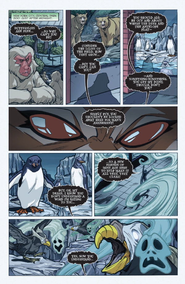 Some people wish for the ability to fully communicate with the animals around us, but when the furry, feathered, and finny inhabitants of the Central Park Zoo star talking and demand their release, the people of New York just wish they’d shut up! Egon Spengler and his EXTREME GHOSTBUSTERS race to answer the call, unaware of one creature’s fiendish plot to control the possessed animals and drive them to attack humanity in revenge for their incarceration.