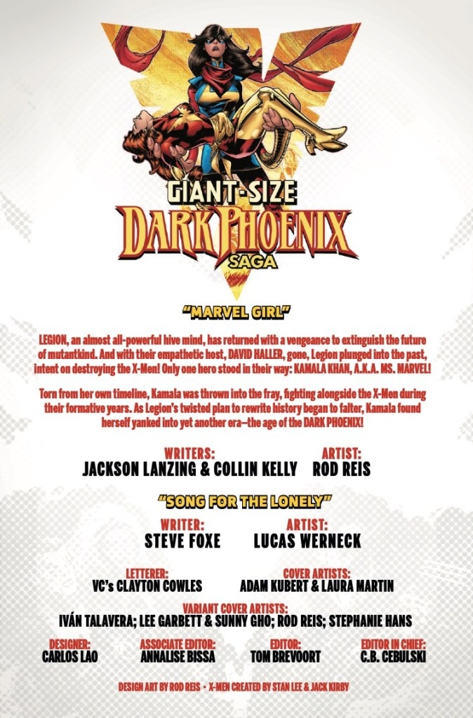 The past isn’t set in stone. Kamala Khan is locked in a battle through time against an unstable and unleashed Legion – and she’s gone from the frying pan into the Phoenix fire. As the history we know is destroyed in front of her eyes, the new mutant must team up with Jean Grey in her darkest hour…and master her dangerous new mutant power! X-Hivemind LANZING and KELLY team with superstar ROD REIS for a cosmic, emotional story that turns history upside down. PLUS: A Revelations backup story that reveals the hidden secret that binds Scott Summer and Jean Grey together, as written by Steve Foxe!