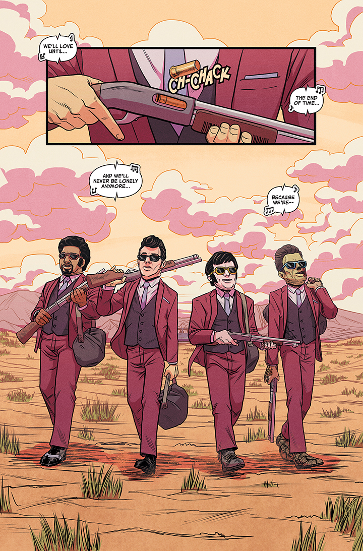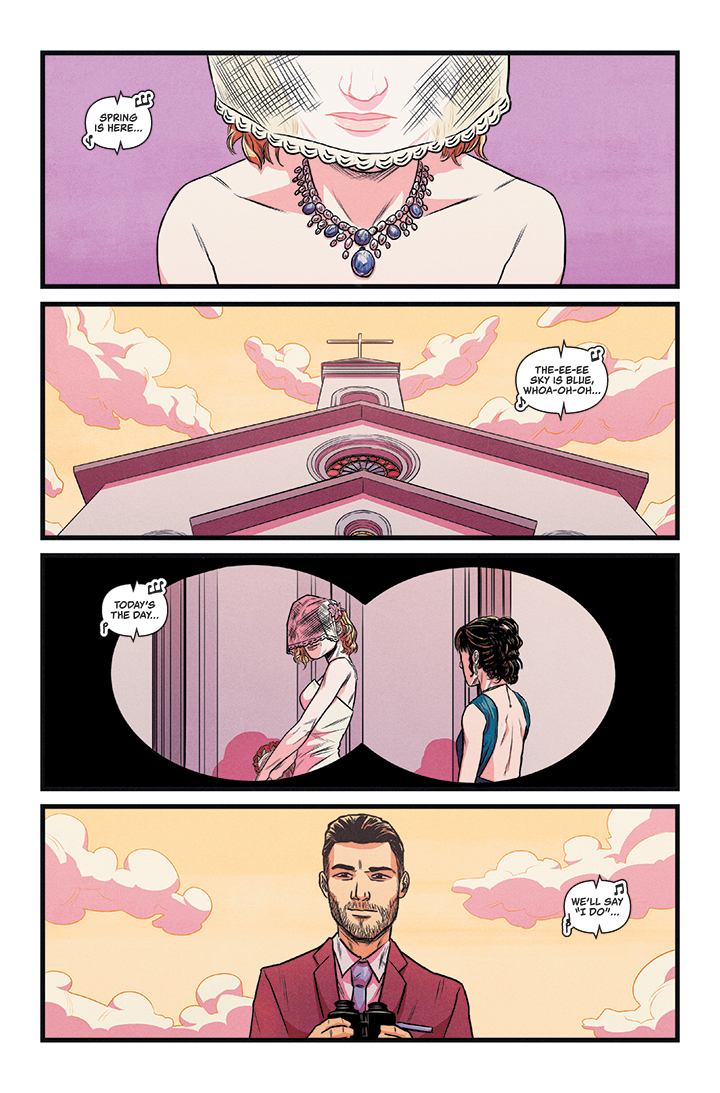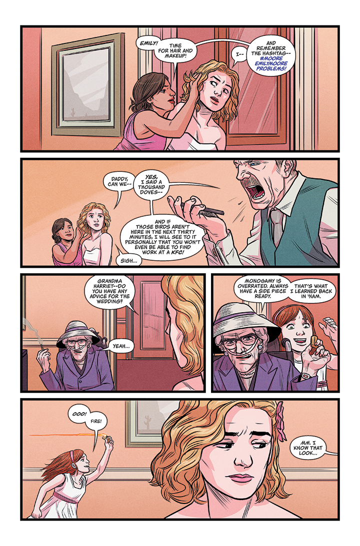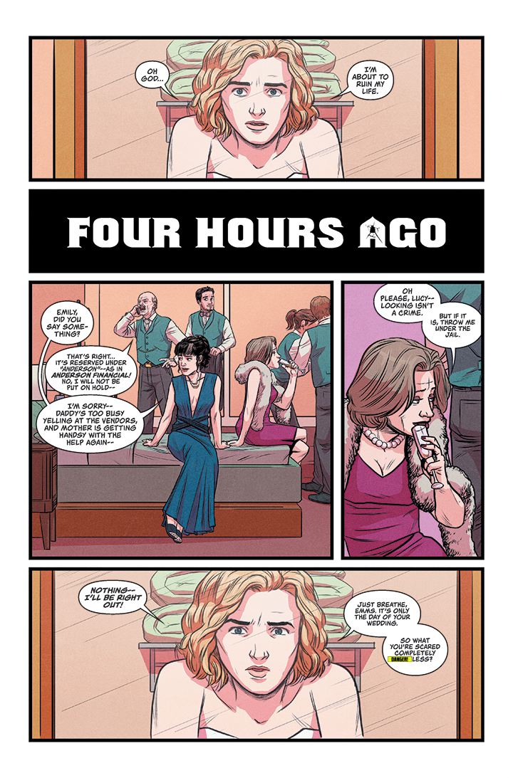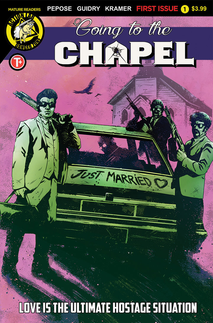Get ready to say yes to distress in GOING TO THE CHAPEL, an insanely action-packed romantic comedy from Ringo Award-nominated writer David Pepose (Spencer & Locke) and rising star artist Gavin Guidry (The Death Defying) at Action Lab: Danger Zone. Emily Anderson’s big day had become the wedding from hell — and that was before the bank robbers showed up. What do a conflicted bride, her dysfunctional family, a gang of Elvis-themed crooks, and one relentless sheriff have in common? They’re all about to discover love is the ultimate hostage situation.