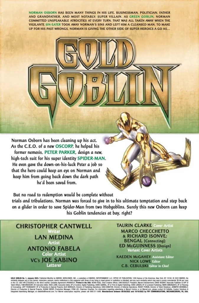 Gold Goblin #1 goes on sale on November 16th, priced $3.99.