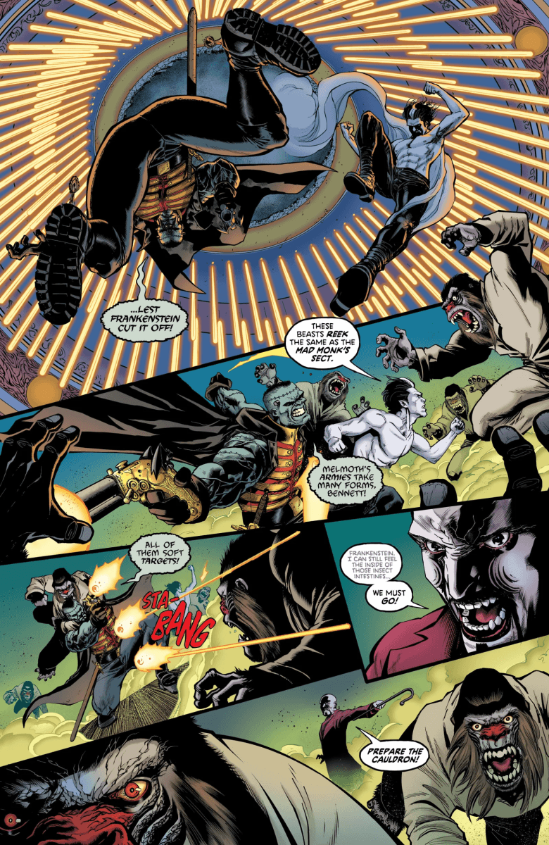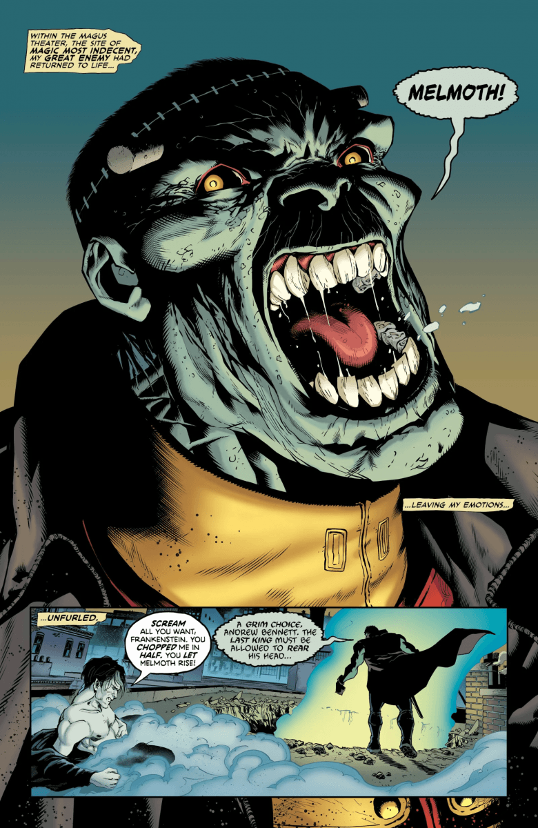 Melmoth’s attack on Gotham City has immediate consequences for the denizens of Monster Town, and the losses suffered by Frankenstein and the other monsters have suddenly made this very, very personal. It’s up to Frankie to convince his cohorts that they need to band together against this common threat, lest all of Gotham-nay, the Multiverse!-fall to the might of his old master. But before they can do that, they must first answer the question: Who is the Red Phantom?