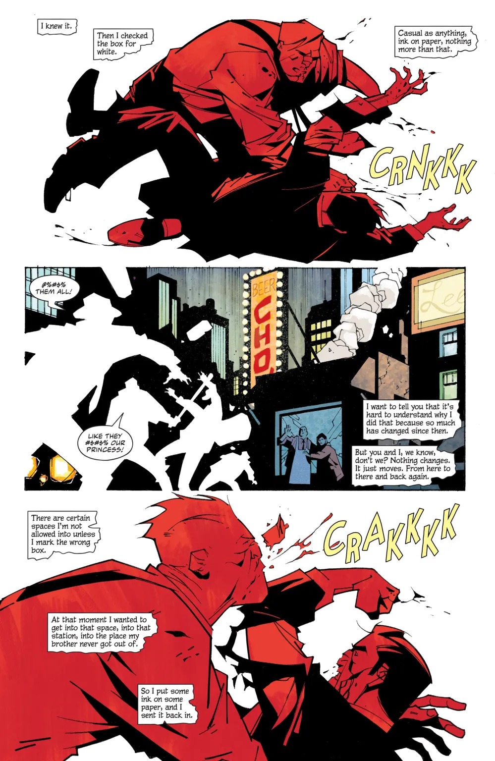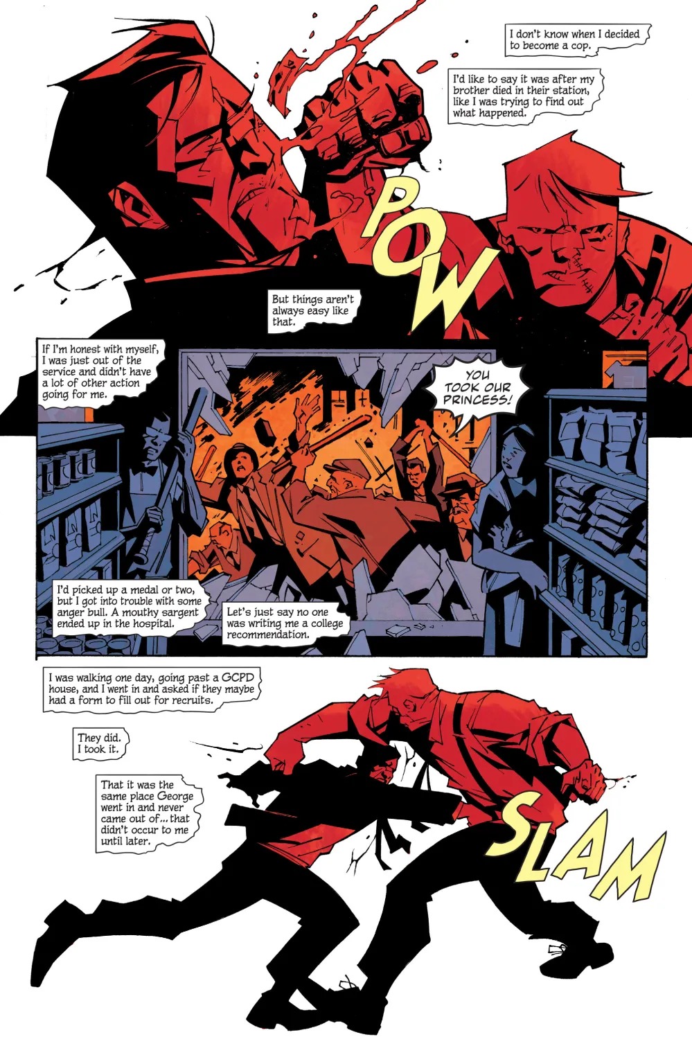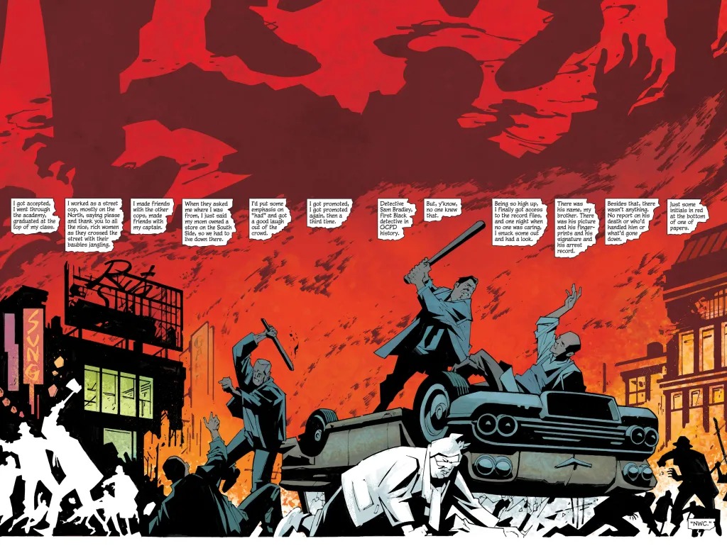 The brutal, bloody conclusion to the year’s most acclaimed title is here. Slam Bradley has never feared walking the hard path alone, but even his courage will be tested by the shocking turn of events that will take Gotham City down a dark, violent path.