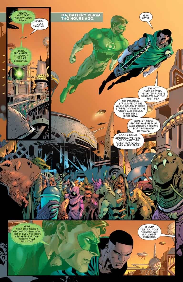 As this new Green Lantern series begins, the newly formed United Planets and the Guardians of the Universe hold an intergalactic summit to decide who can best serve and protect the cosmos from danger. With the majority of Green Lanterns called back to Oa, John Stewart arrives alongside Teen Lantern Keli Quintela, whose powerful gauntlet could be one of the most powerful and unstable weapons in the universe. With the entire landscape of the universe in flux, is this the end of the Green Lantern Corps…or a new beginning?