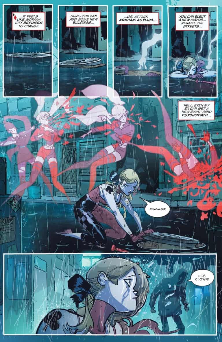 Ahem! You better read this closely, ’cause we’ve got a red-hot relaunch on our hands here-and I should know! Harley Quinn here to let everyone know that I got a brand-new monthly series here with a brand-new status quo. I’m coming back to Gotham City to make up for the sins of my past, and help the city recover from “The Joker War”!