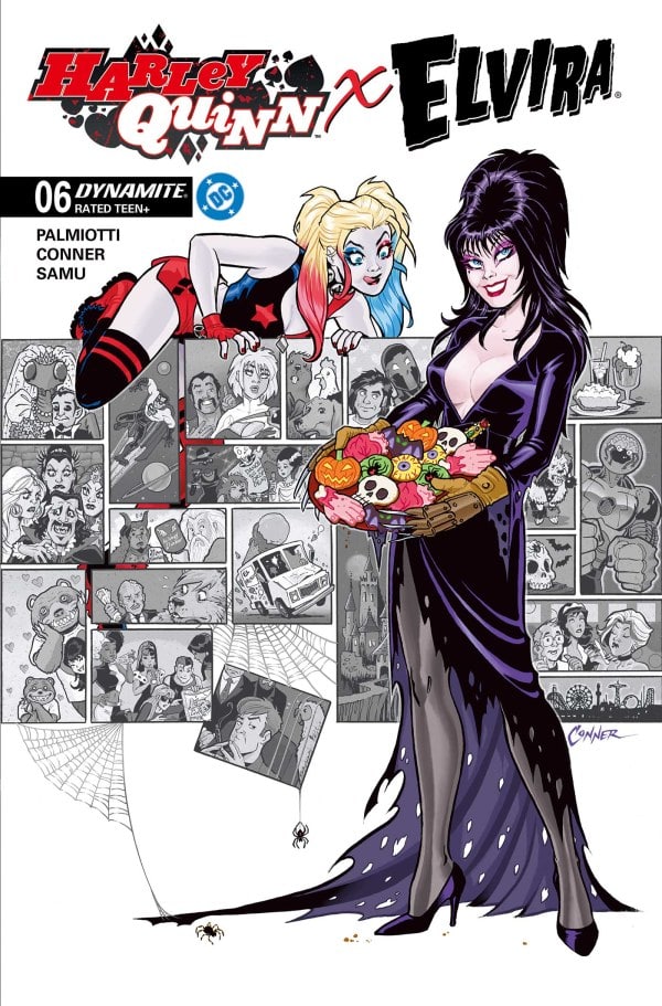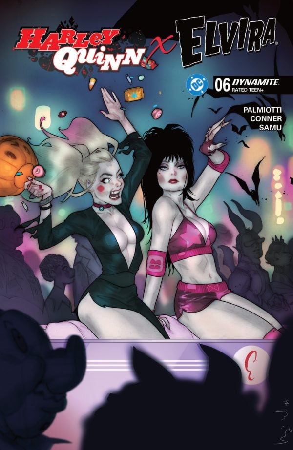 Carefully crafted by the crazed creative team of AMANDA CONNER, JIMMY PALMIOTTI, and JUAN SAMU, the crossover event of the century comes to a climactic close in Harley Quinn X Elvira #6 — clad in commemorative covers by CONNER, JOSEPH MICHAEL LINSNER, CHAD HARDIN, and BEN CALDWELL.
