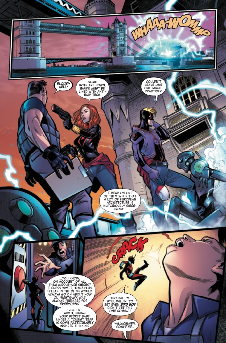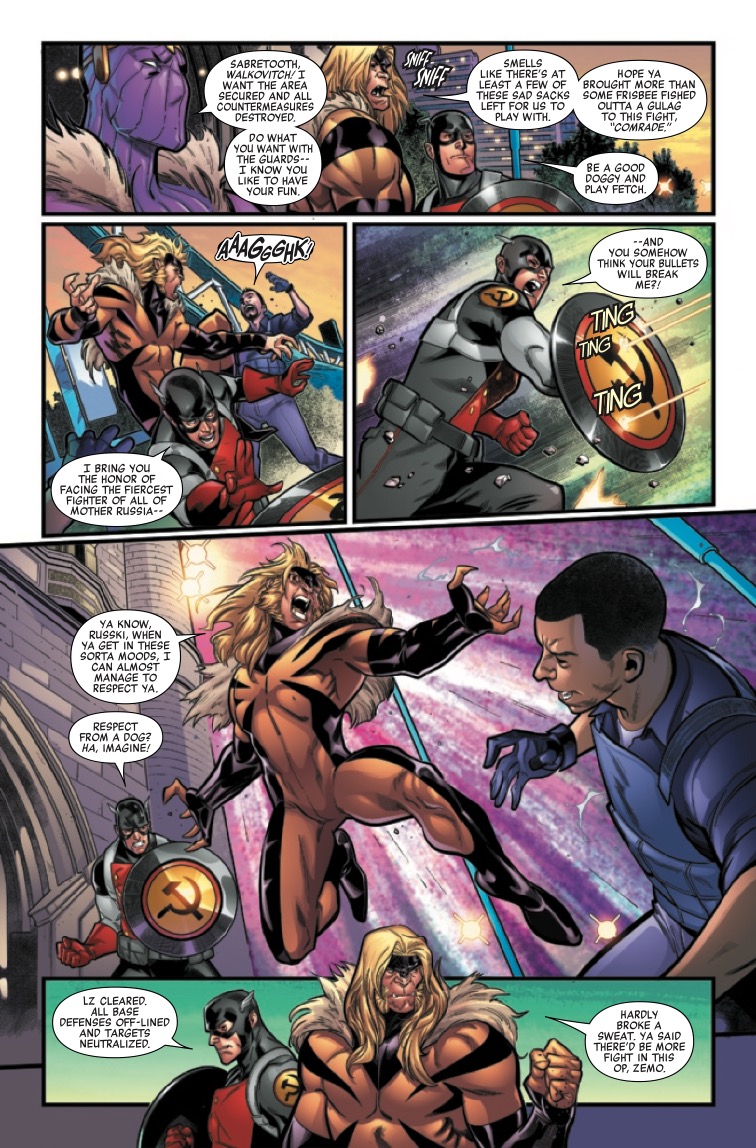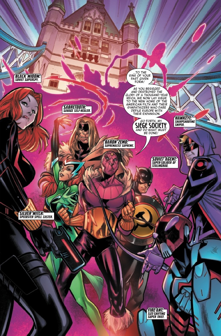 BLACK WIDOW & HAWKEYE LEAD AN ASSAULT ON THE SQUADRON! After the Civil War that split the Squadron Supreme in half, Nighthawk formed his own Squadron in Europe. But not all of Europe is okay with it. Baron Zemo has put together his own team to take them down. Who’s on this team? Natasha Romanov, Clint Barton, Scott Lang and Victor Creed. The Squadron doesn’t stand a chance.