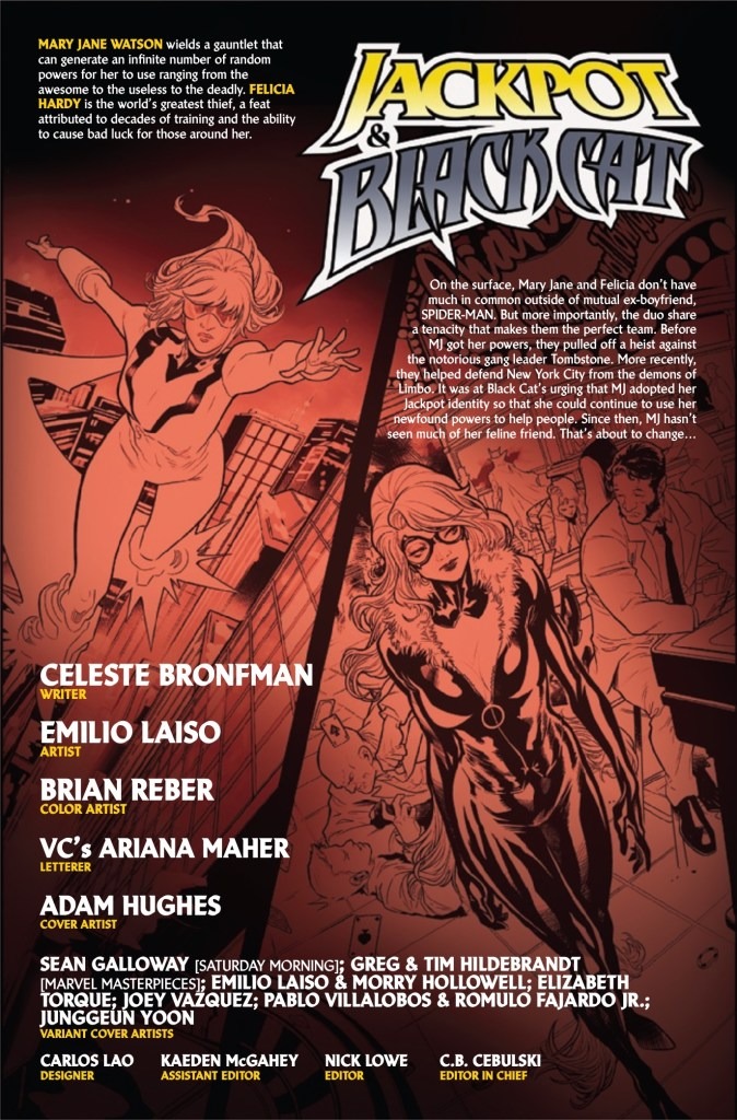 LUCK BE THE LADIES! The most exciting new hero in the Marvel U, JACKPOT, A.K.A. Mary Jane Watson, gets her first action-packed limited series as a super hero alongside the other best female character in comics, BLACK CAT! When someone blackmails Black Cat into a public and blatant crime spree, Jackpot comes to her aid! What classic Spider-Villain is behind the blackmail?! Someone with history with at least one of our titular heroines!