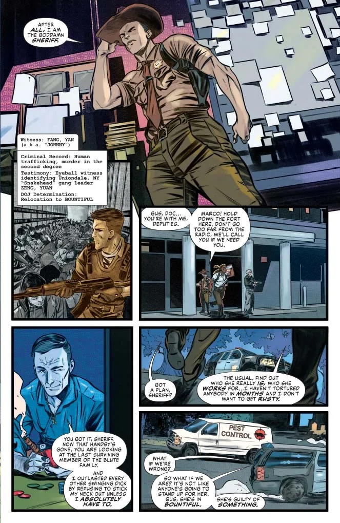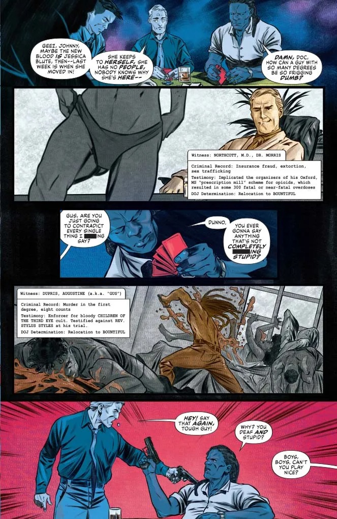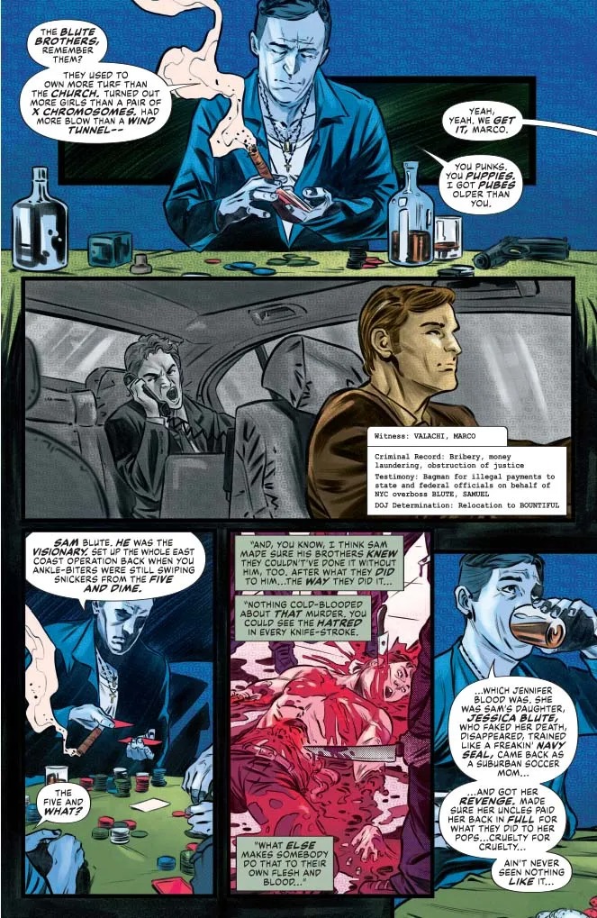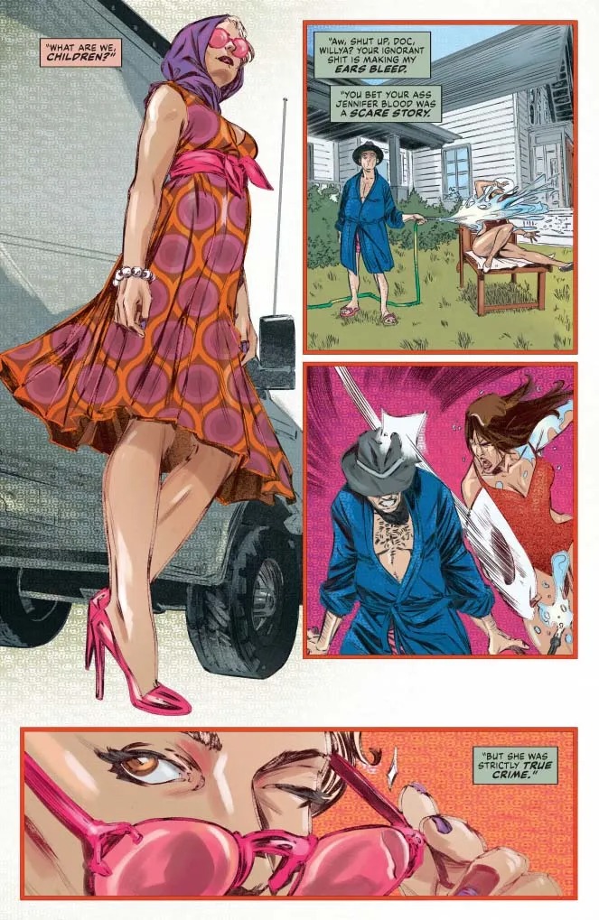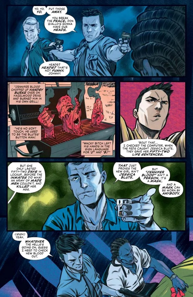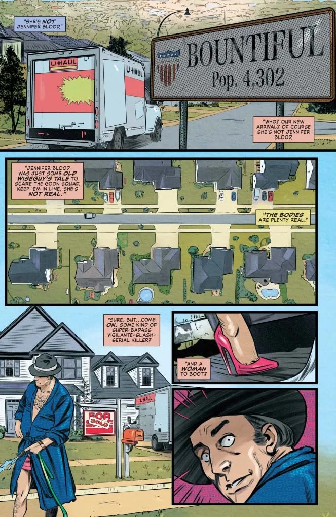 So…once upon a time, a suburban housewife spent her nights as a mobster-murdering assassin, named JENNIFER BLOOD. Then she died…or did she? Because in the cozy cul-de-sacs of Bountiful, Utah, a noticeable number of normal people have gone missing. And by “normal,” we mean “mobsters under witness protection.” And by “missing,” we mean killed by someone that looks, sounds, and murders a lot like JENNIFER BLOOD…