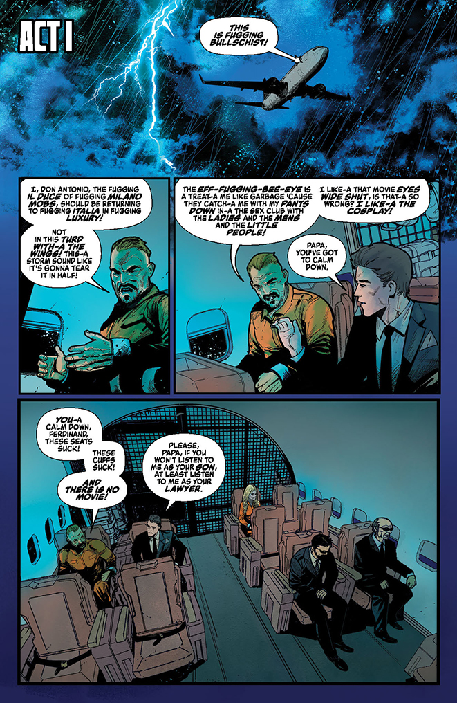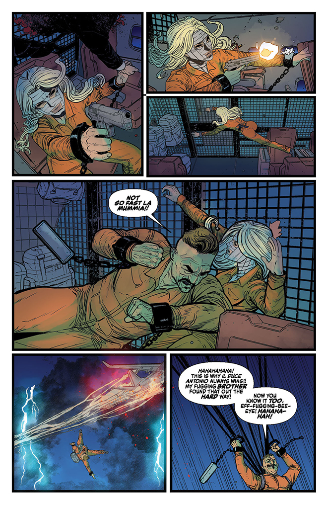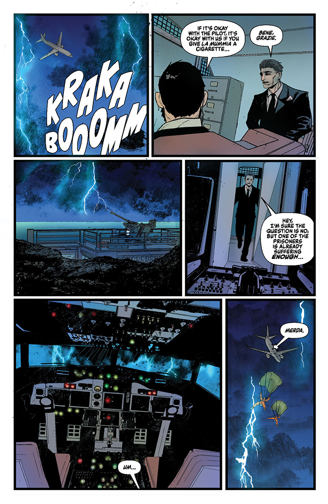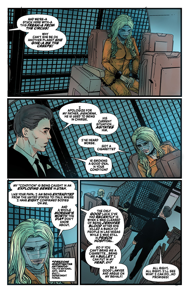 Slamming her way out of the pages of the recent Jennifer Blood: Bloodlines series, Italian assassin Giulietta Romeo stars in “La Tempesta,” a noirish reimagining of the William Shakespeare play The Tempest. Giulietta is being extradited to Italy after the events of the “Bountiful” storyline when her plane is shot down over a remote island in the Atlantic, a former Nazi stronghold that is now the tiny kingdom of a man named Prospero, a former duke of the Naples mobs. His brother, the man who usurped his position, was being extradited on that same plane, and Giulietta finds herself in the middle of a gory blood feud and fighting for her life against Prospero’s monstrous servants, Caliban and Ariel.